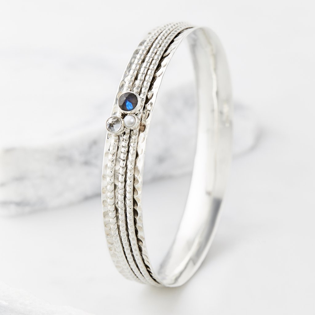 Ethereal Galaxy Silver Spinning Bangle - Labradorite, Pearl & White Topaz