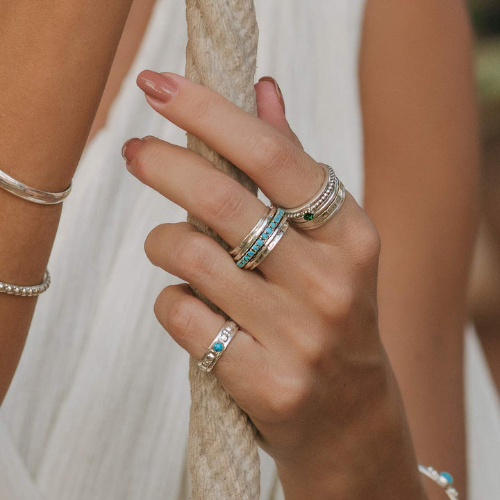 This Parvati Silver Spinning Ring - Turquoise by Charlotte's Web Jewellery is a handcrafted spinning ring designed to calm the mind and empower the soul. Inspired by ancient Tibetan prayer wheels and the goddess Parvati, it is set with turquoise stones around the entire band, symbolizing clarity, protection, and strength. It is hypoallergenic and nickel-free.