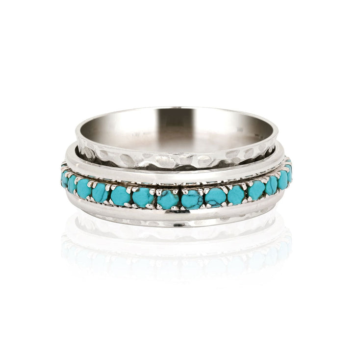 This handmade spinning ring is made of sterling silver and is set with turquoise stones around the entire band. It is hypoallergenic and nickel-free.