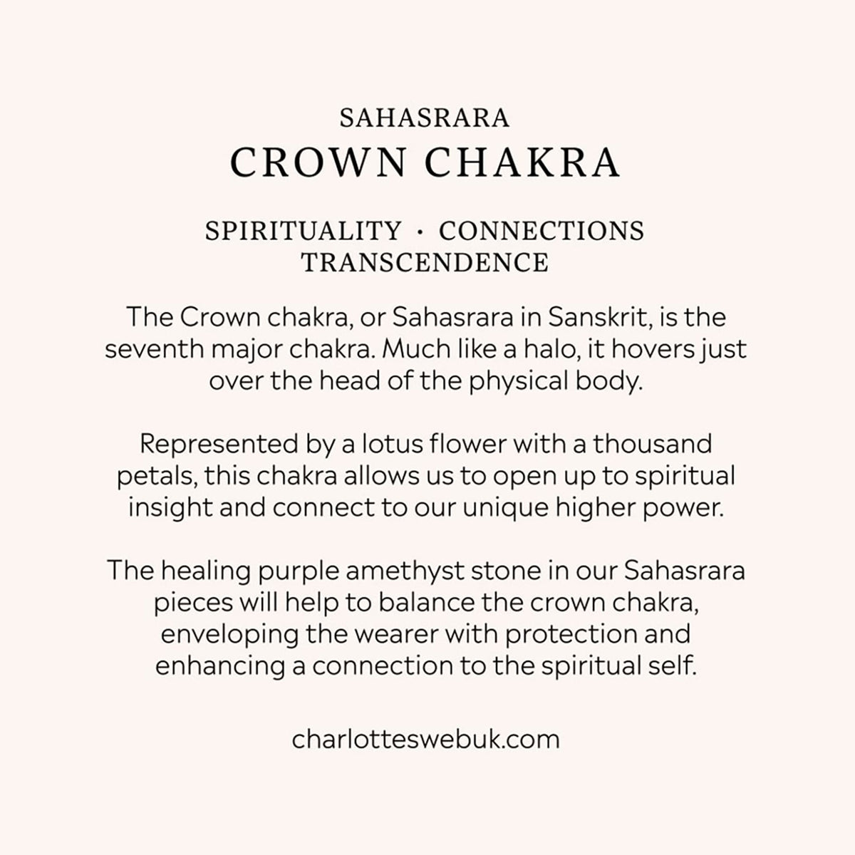 This Crown Chakra Gold Vermeil Necklace by Charlotte's Web Jewellery is an enchanting piece inspired by the lotus flower, a symbol of enlightenment and connection. Bejewelled with a genuine amethyst, the February birthstone, this necklace is designed to balance the Crown Chakra, our spiritual connection to the universe. When worn, it serves as a beautiful reminder to envision the bigger picture and find harmony within.