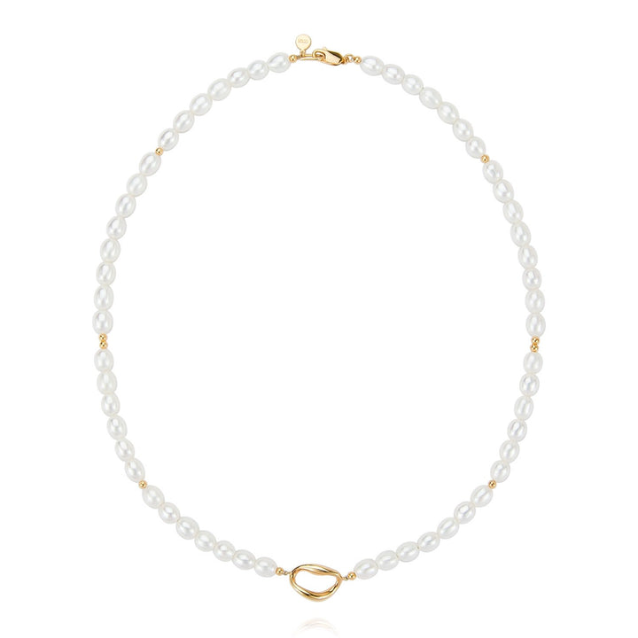 This necklace is made with sterling silver and 18ct gold vermeil and features freshwater pearls.