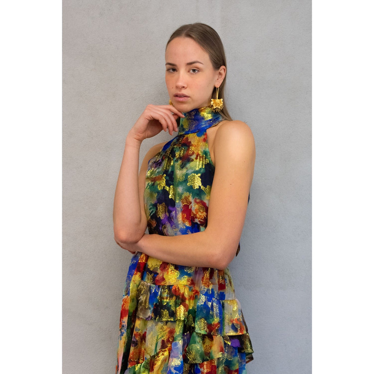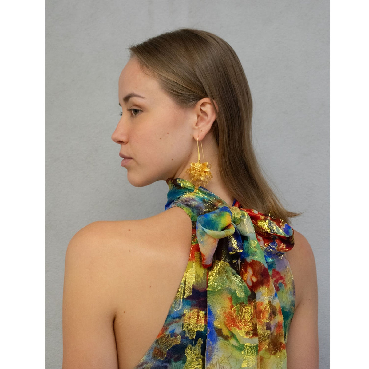 These Golden Lotus Drop Earring by Cuda are a beautiful symbol of resilience and optimism. The delicate design, crafted from gold-plated brass and a multitude of citrine stones, reflects the importance of rising above difficulty. These earrings are a perfect way to express your strength and personal power with a touch of radiant elegance.