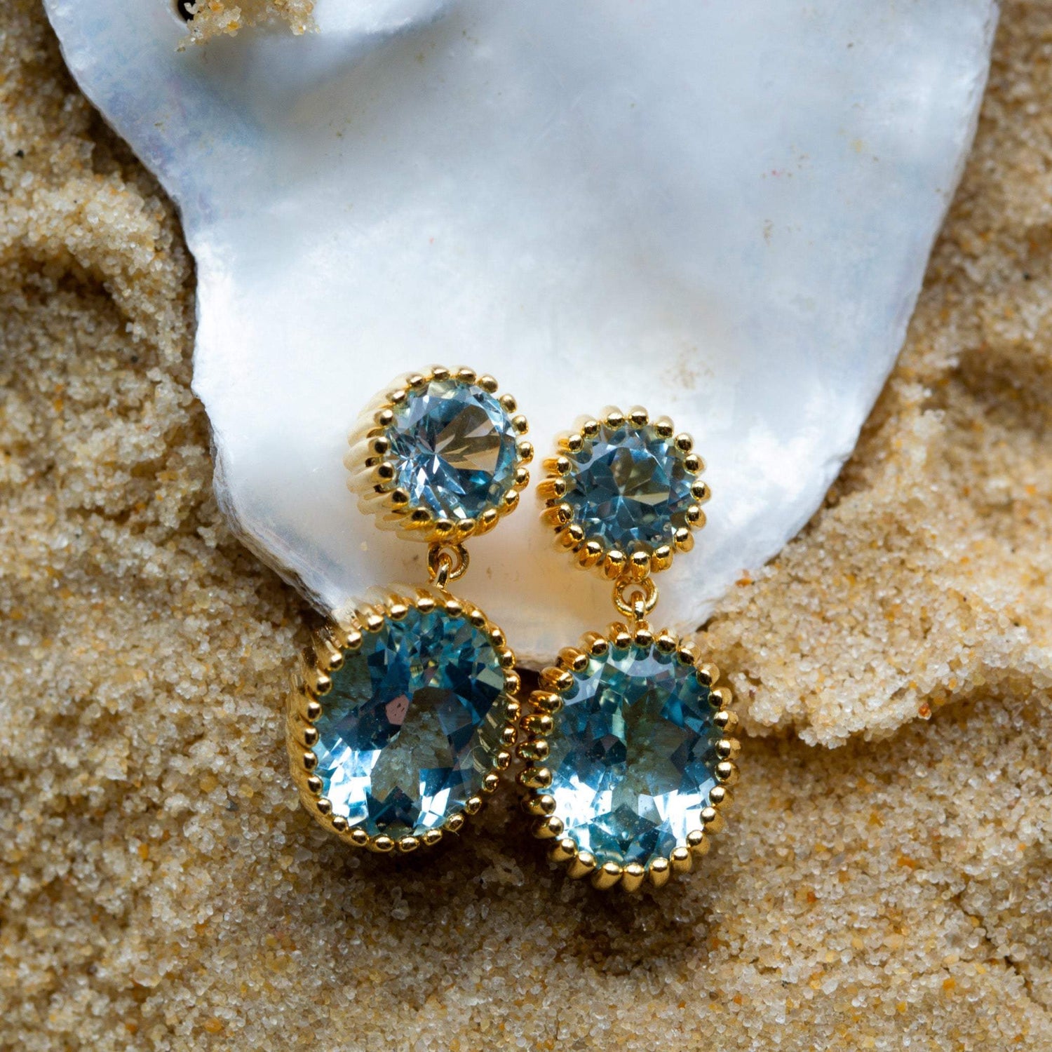 The Gold Sky Blue Topaz Aurelia Earrings by Dainty London are a distinctive pair of statement earrings. Inspired by mythology and coastal elements, these earrings feature summer sky blue topaz gemstones set against a unique barnacle-textured surface. The gold vermeil and blue topaz create a beautiful contrast, making these earrings a stylish and unique accessory.