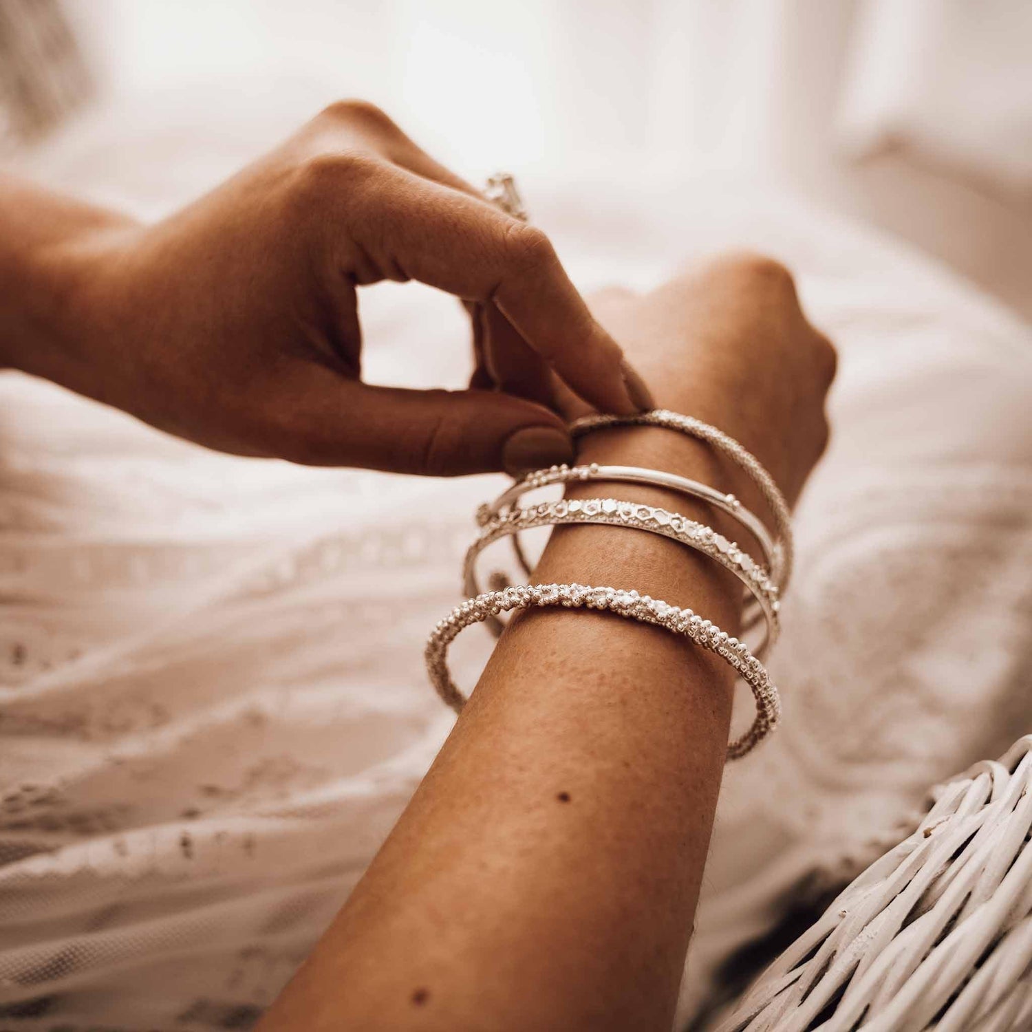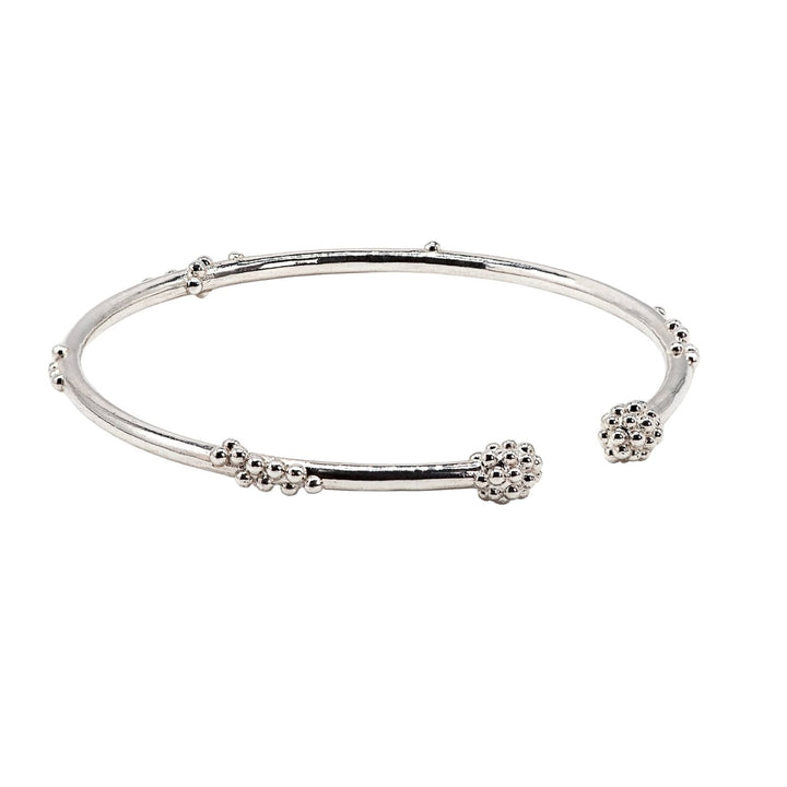 This bangle is crafted from recycled sterling silver and finished with a granulation technique. It has a standard inside diameter of 7.5cm, making it a perfect one-size-fits-all piece.