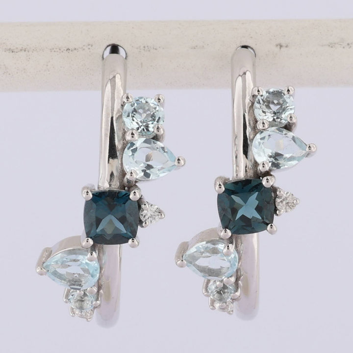 These earrings are crafted from sterling silver and feature a gradient of ethically sourced topaz gemstones: London blue, sky blue, and clear white topaz. They are 2cm in size.
