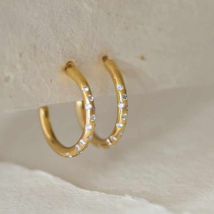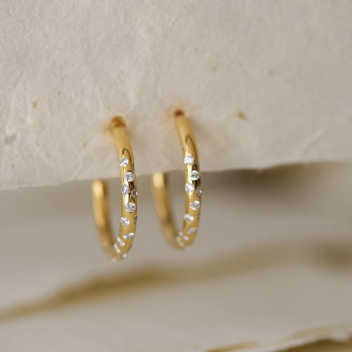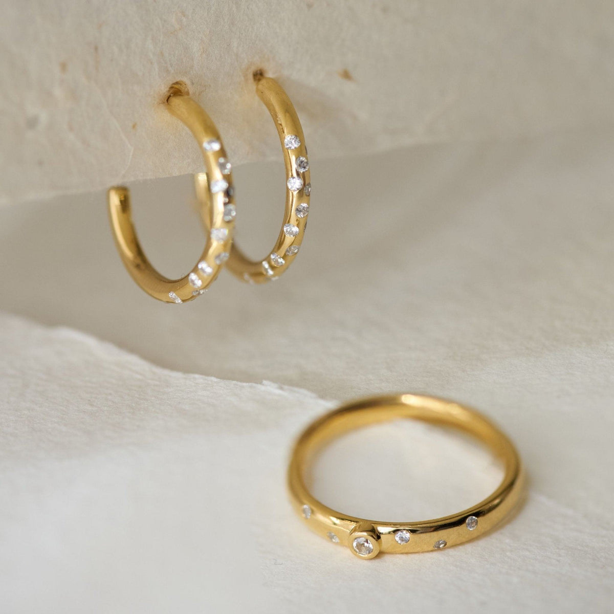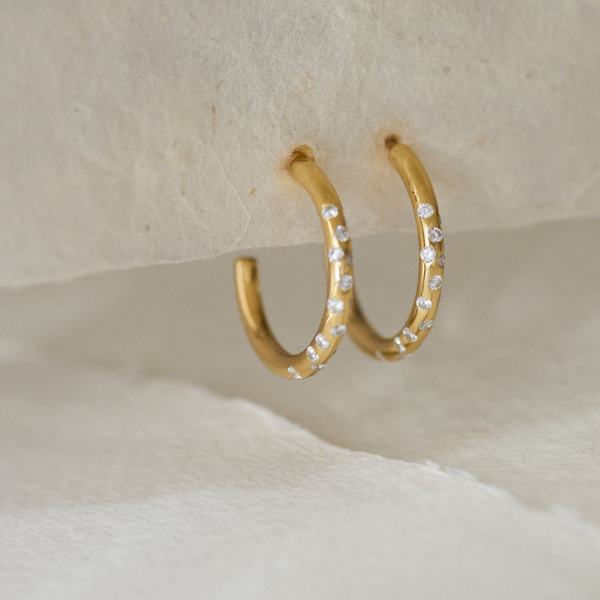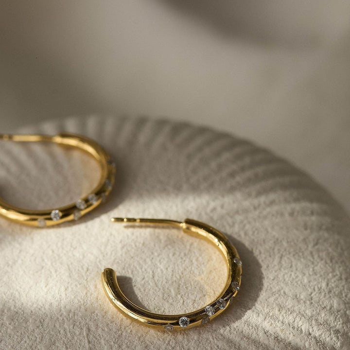 These Seren Hoops by Dainty London are elegant and celestial-inspired. Named after the Welsh word for "star," these 18ct gold vermeil hoops feature fourteen white topaz gemstones, positioned to reflect the pattern of constellations. Their subtle sparkle and contemporary finish make them perfect for both everyday wear and special occasions.