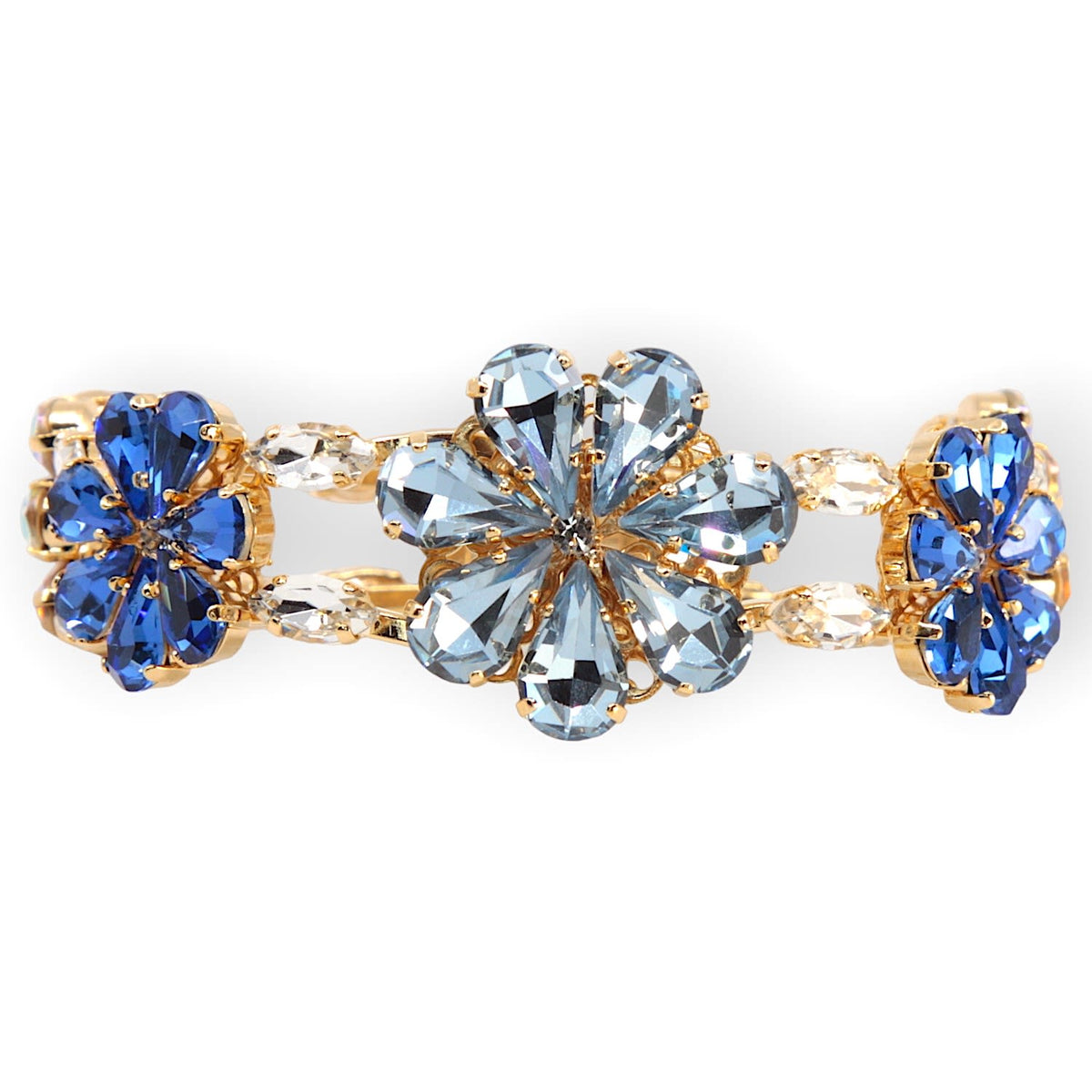 This bracelet is made from 24-karat gold-plated brass and is adorned with crystals in shades of aquamarine and sapphire. It is nickel-free and handcrafted in Italy.