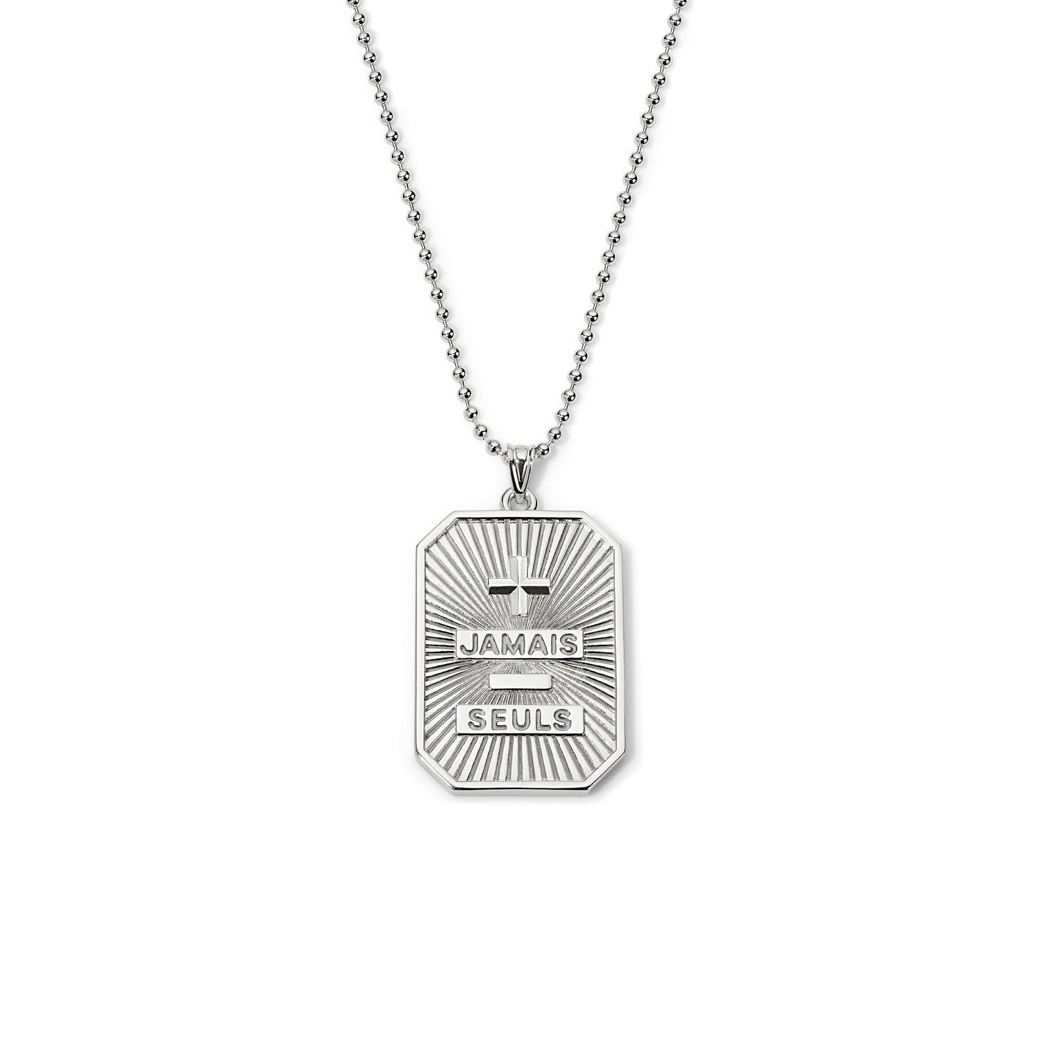 The Jamais Seuls Dog Tag - Sterling Silver by Déclarer is a bold and meaningful accessory. The dog tag, which carries the French love poem "Qu'hier que demain," is made from 925 sterling silver. It features the iconic plus and minus symbols, a statement of "Never Alone," making it a strong, durable, and sentimental piece for everyday wear.