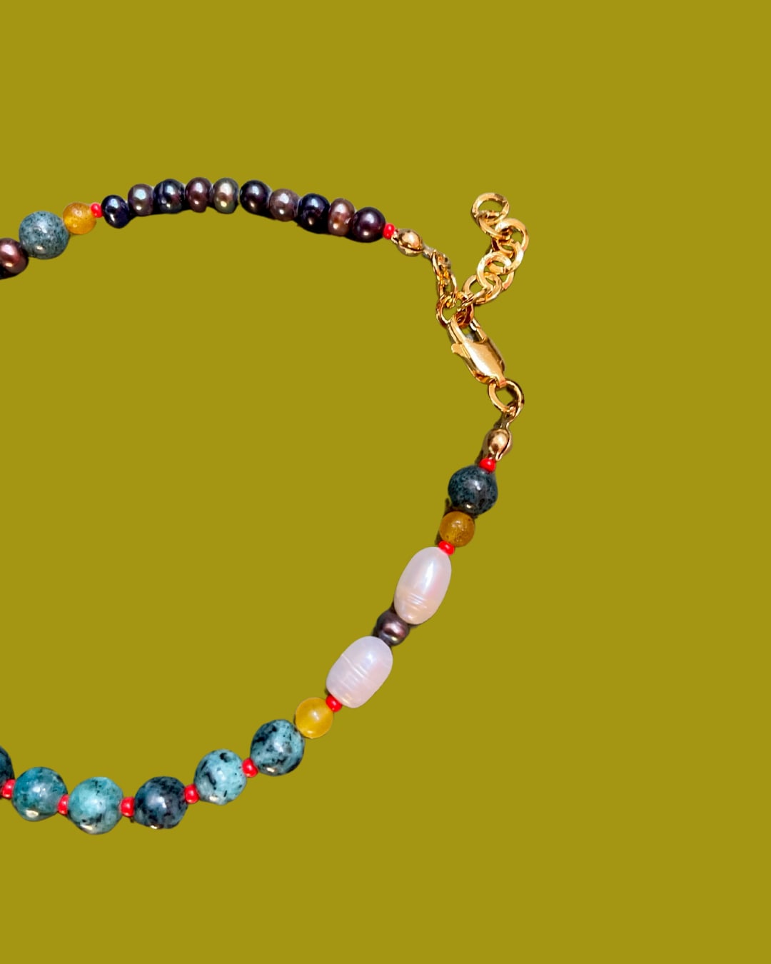 This anklet is made with pearl, agate, glass, jade, Murano glass, and black pearl beads.