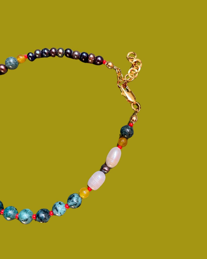 The Spice Up Beaded Anklet by Desert Lobby is a vibrant and unique accessory for those with "bold souls and fiery hearts." This handmade anklet features a lively mix of beads, including pearl, agate, glass, jade, and black pearl. Since each bead is individually shaped and strung, every piece has slight variations in tone and form, adding to its charm and individuality.