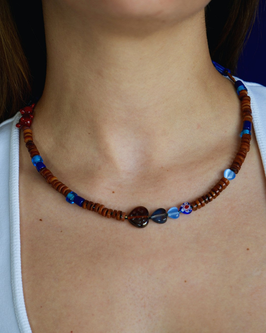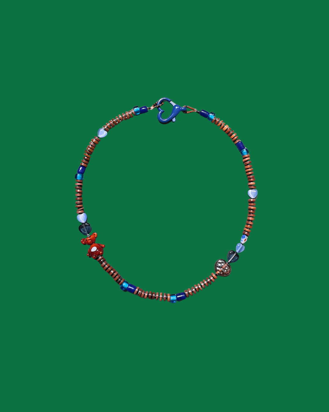 This Nineties Kid necklace by Desert Lobby is a nostalgic and charming piece that serves as a love letter to the whimsical magic of childhood. Its playful, stickerbook-sweetheart aesthetic features a colorful mix of glossy glass beads and a wonderfully cute Murano glass teddy bear charm. Each necklace is unique, with tiny variations that add to its handcrafted charm. This piece is a celebration of joyful memories and a perfect way to add a touch of nostalgic fun to your style.