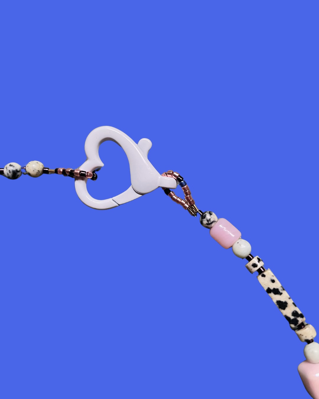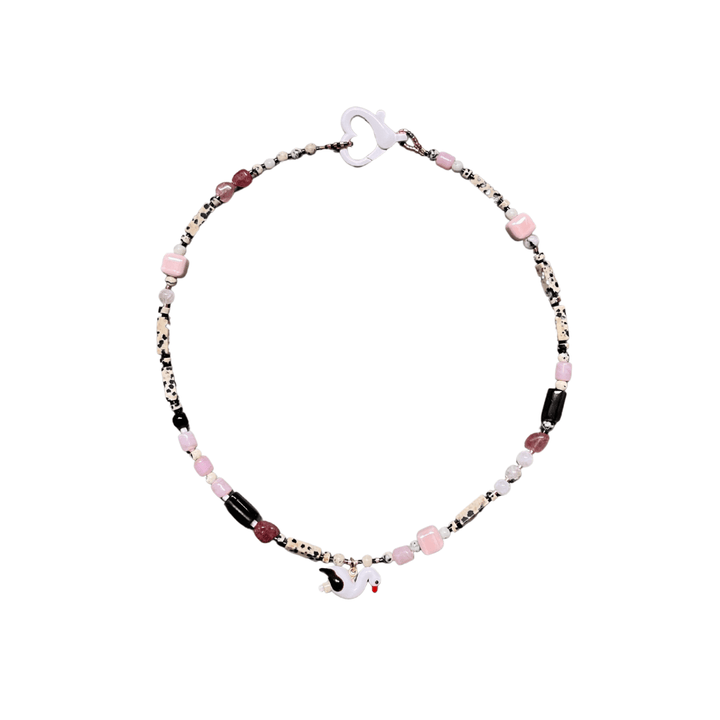 This Nathalie necklace by Desert Lobby is a unique and enchanting piece that features a single strand of carefully selected gemstones and a hand-blown Murano glass swan charm. Each bead is handmade, making every necklace a little different. The mix of Strawberry Quartz, Moonstone, and Jade creates a delicate and captivating aesthetic, making this necklace a graceful and artistic statement piece.