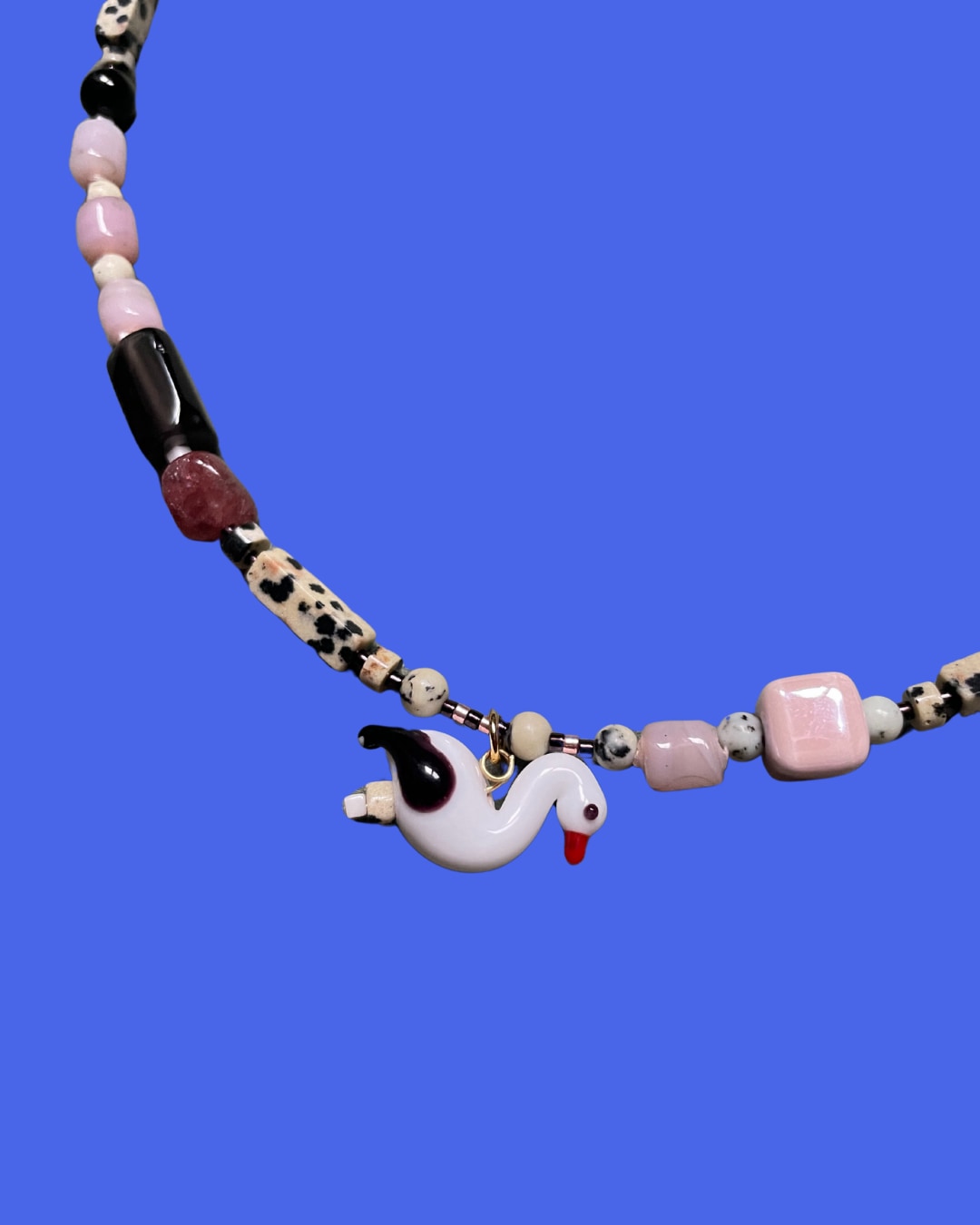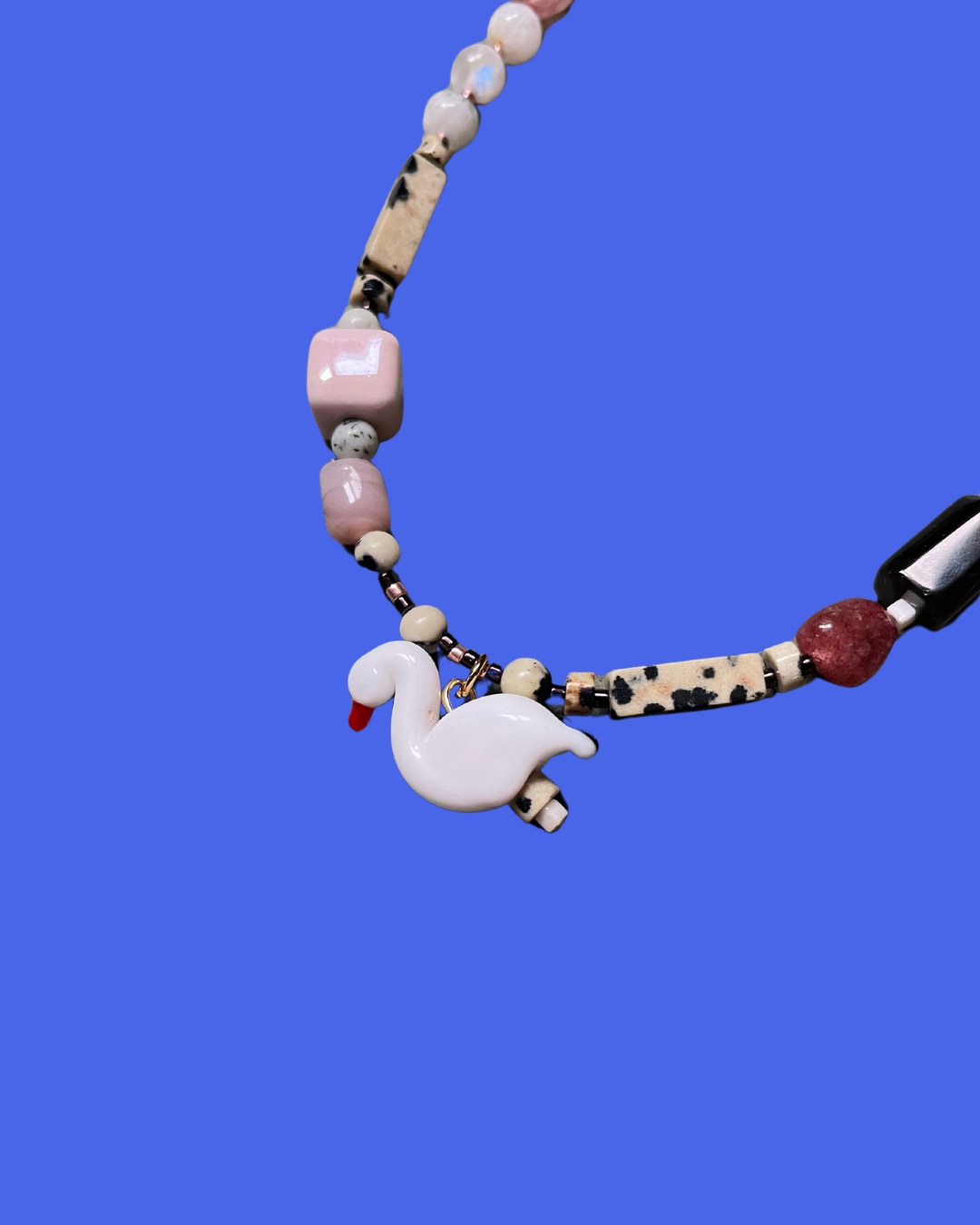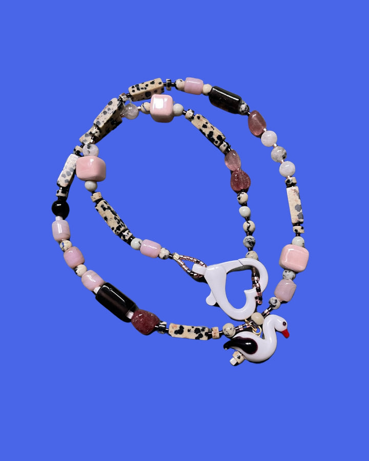 This handcrafted beaded necklace features a variety of gemstones and materials, including Strawberry Quartz, Moonstone, Indian Glass, Jade, Jasper, Miyuki, and Ceramic beads, with a Murano Glass swan charm.