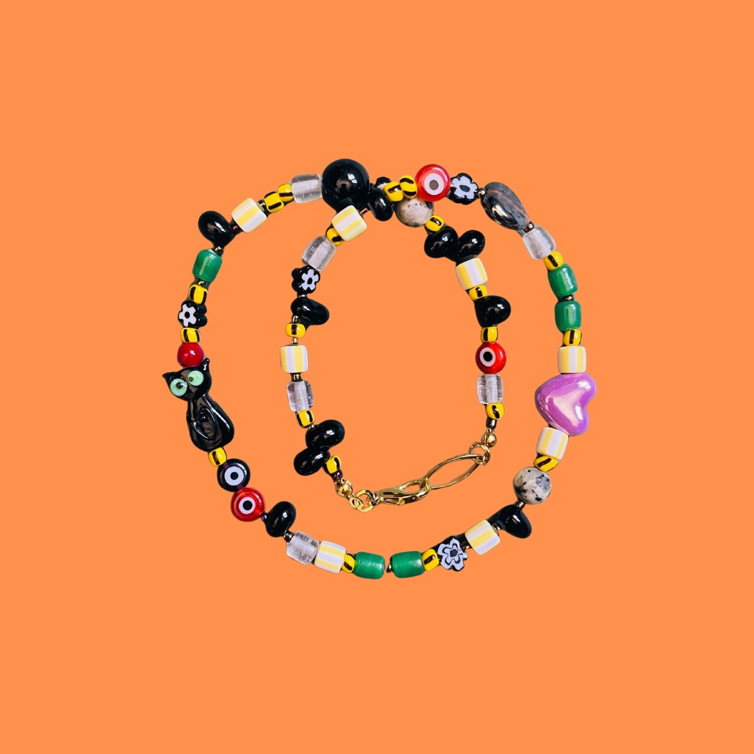 This handcrafted beaded necklace features a variety of materials including Acrylic, Glass, Fimo, Indian Glass, and a Murano glass black cat charm.
