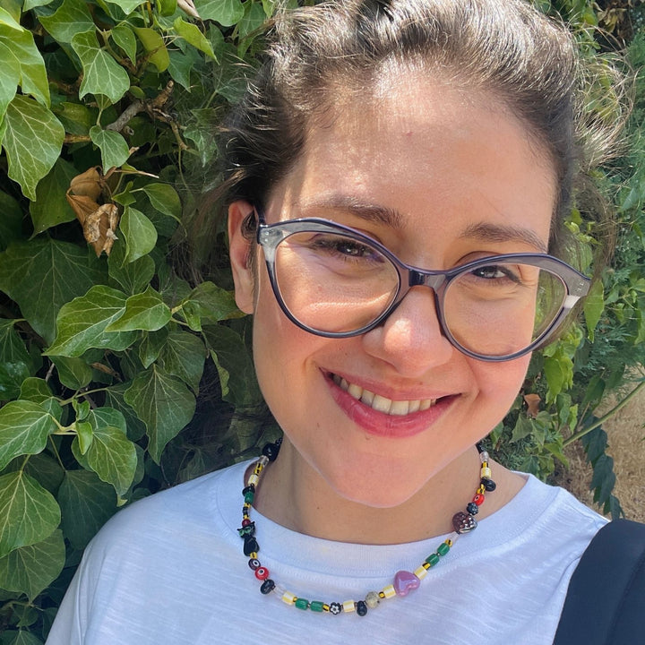 The Paspas Cat Necklace by Desert Lobby is a playful and mystical tribute to the charming chaos of cats. The centerpiece is a Murano glass black cat charm, surrounded by vibrant evil eye beads and a purple heart. This handcrafted necklace, with its cheerful mix of different bead types, captures the spirit of a feline muse. Every piece is unique, with slight variations that add to its character and charm.