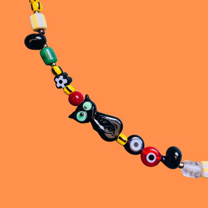 Paspas Cat Necklace – Beaded Necklace With Murano Glass Black Cat Charm, Evil Eye Beads & Colorful Accents