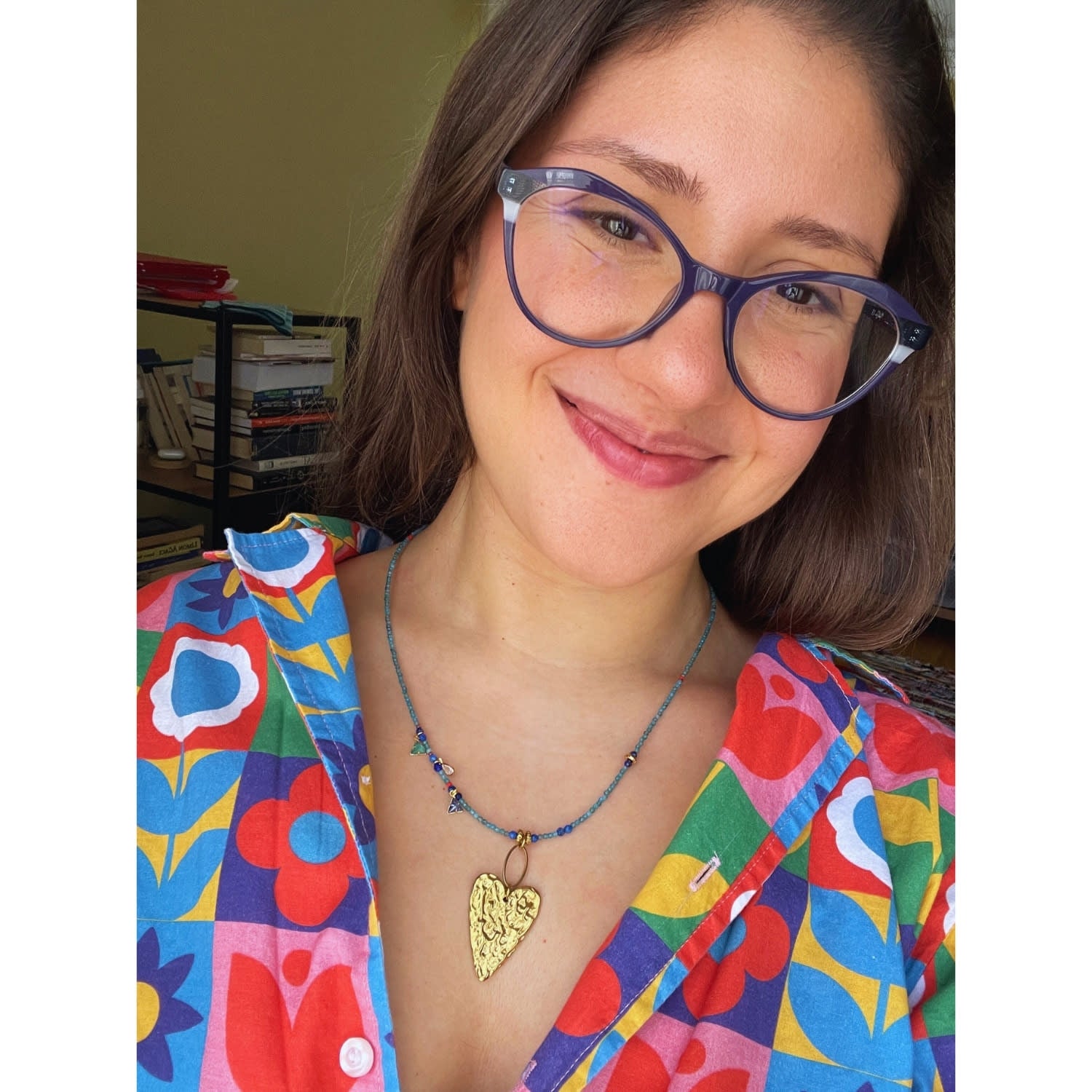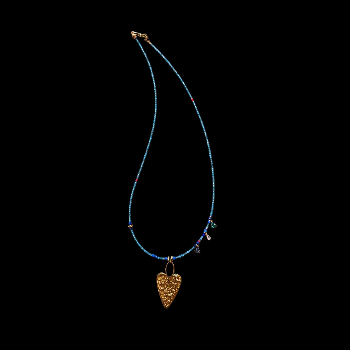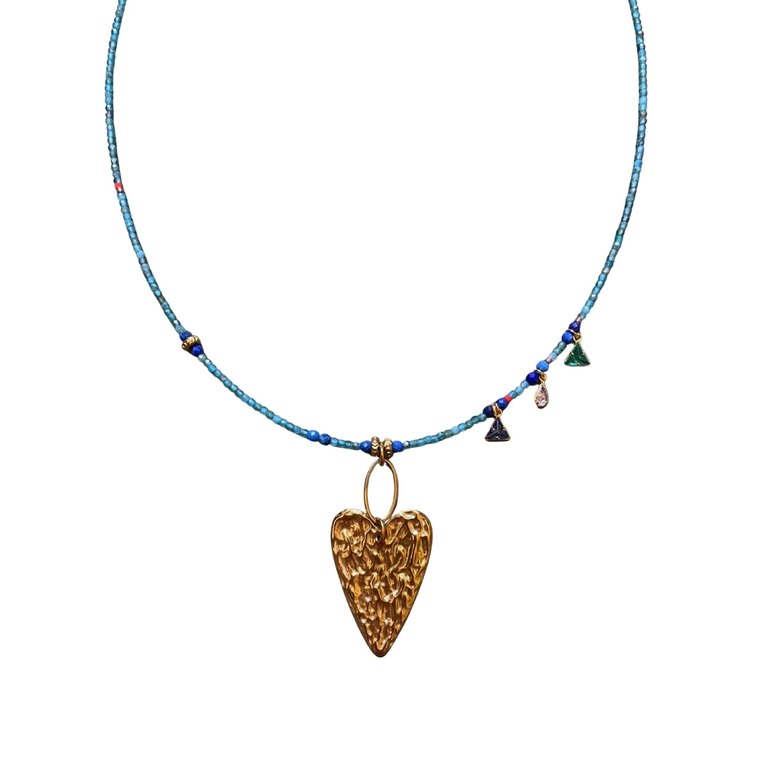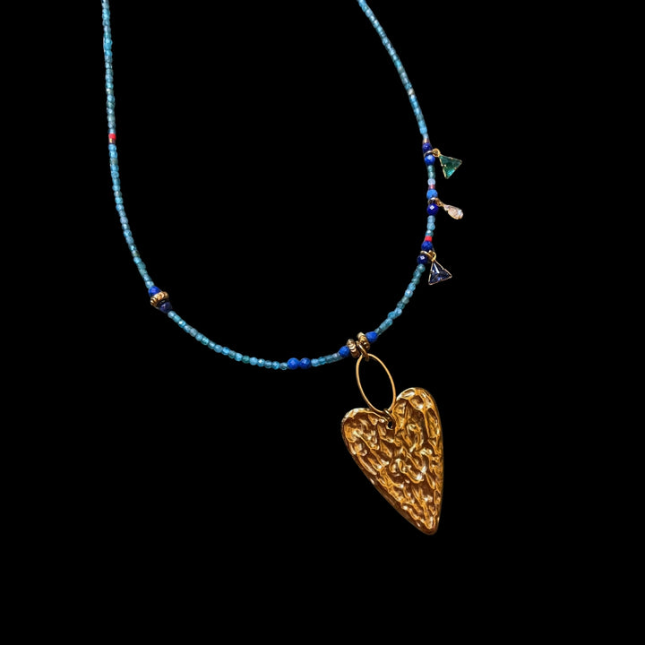 This handcrafted beaded necklace features Apatite gemstone beads, Lapis Lazuli gemstone beads, Miyuki glass beads, a stainless steel melting heart pendant, and a stainless steel clasp.