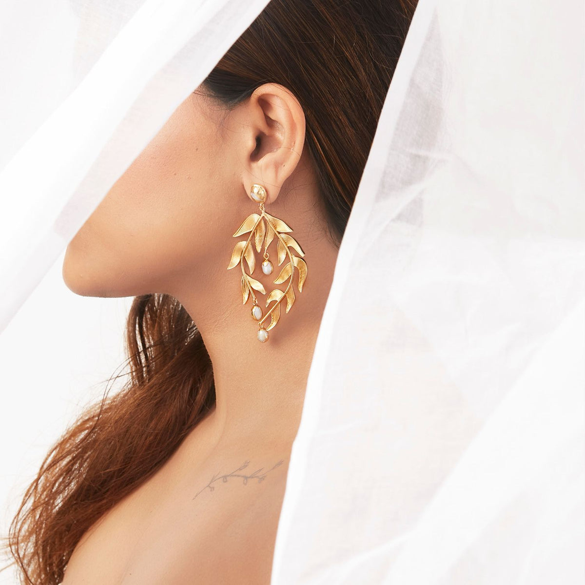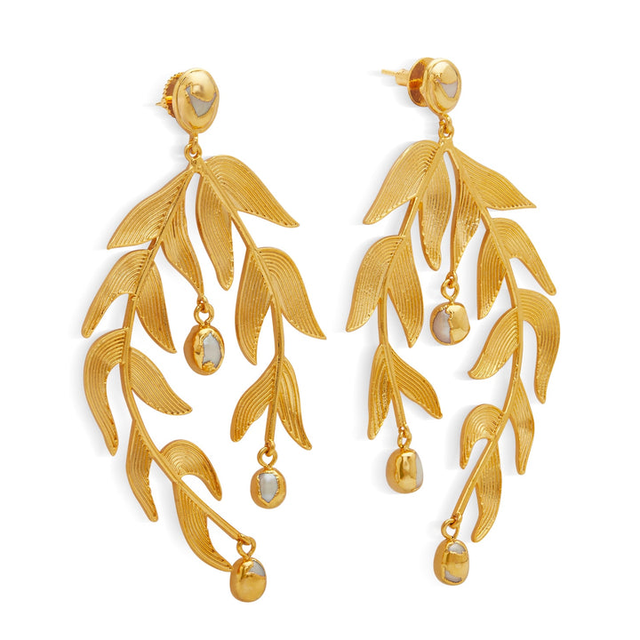 Handcrafted from 22-karat gold-plated brass with textured details, these earrings are set with baroque pearls.