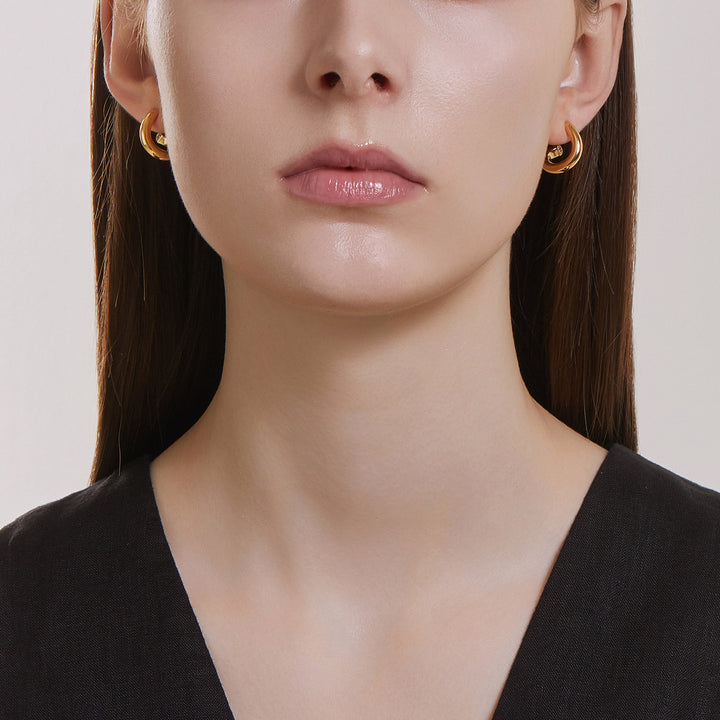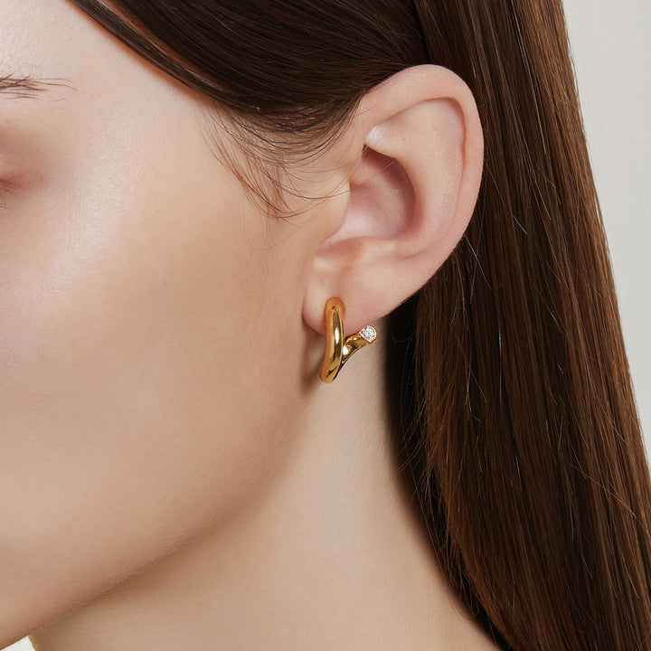 These Sélection. D Open Hoop Brass Earring by Didier Dubot are sculptural yellow gold-plated hoops. They feature the perfect D-curve, accenting a shimmering cubic zirconia stone. These hoops can be styled on their own or as part of a stack to create a timelessly cool look.