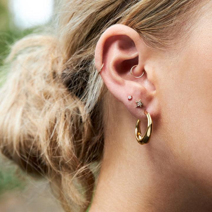 These Thalassa Tapering Chunky Hoops by Dinny Hall are a modern twist on a classic hoop. Hand-carved from 100% recycled metals and finished with 22k yellow gold vermeil, these hoops have a faceted, light-refracting surface that truly gleams. They make a mini-statement and are perfect for everyday wear.