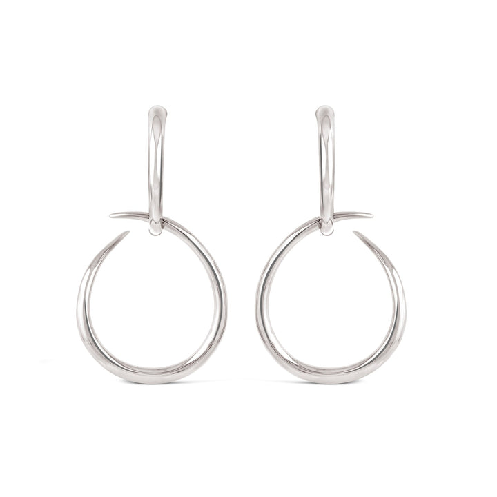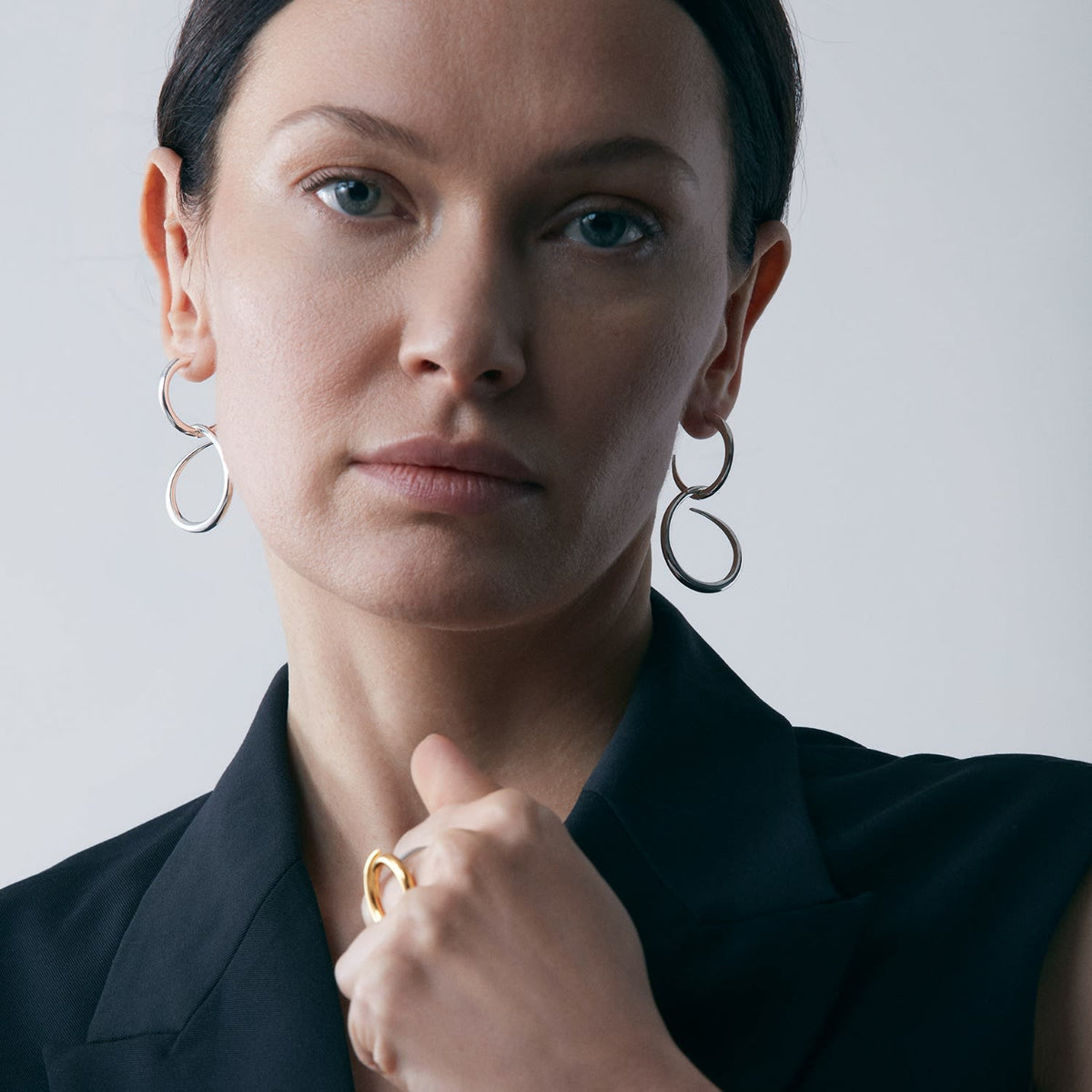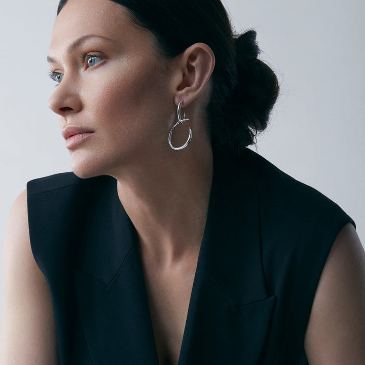 These Toro Large Drop Hoops by Dinny Hall are a sophisticated and sculptural accessory for the bold. Crafted in recycled sterling silver, these hoops revisit the iconic motif of the tapering horn, creating a statement piece that will be the perfect finishing touch to your minimalistic outfits.