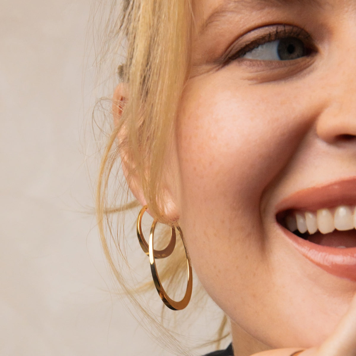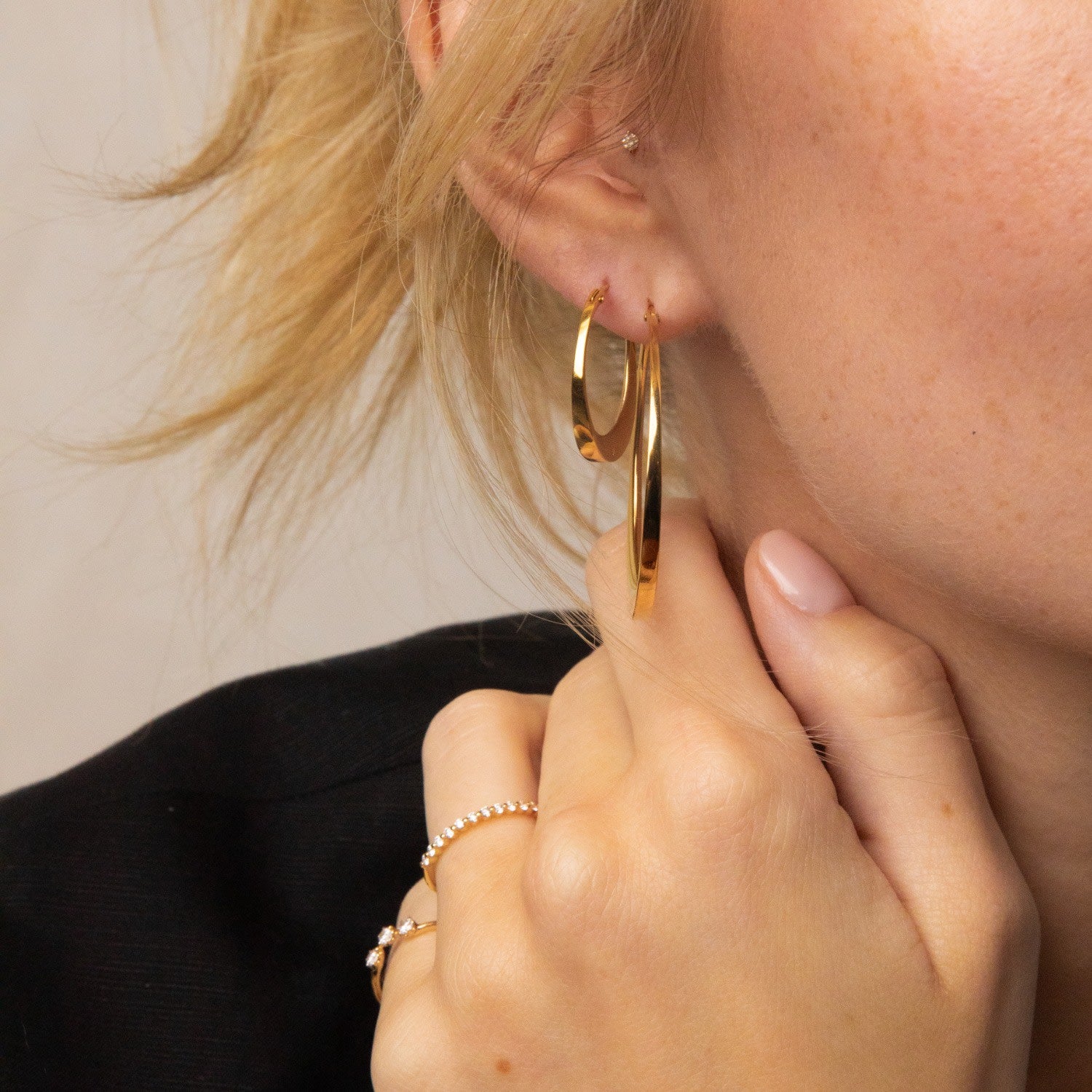 These hoop earrings are crafted from 22k Gold Vermeil. To keep them safe, store them in their jewelry box or pouch. Store them separately to avoid scratches.