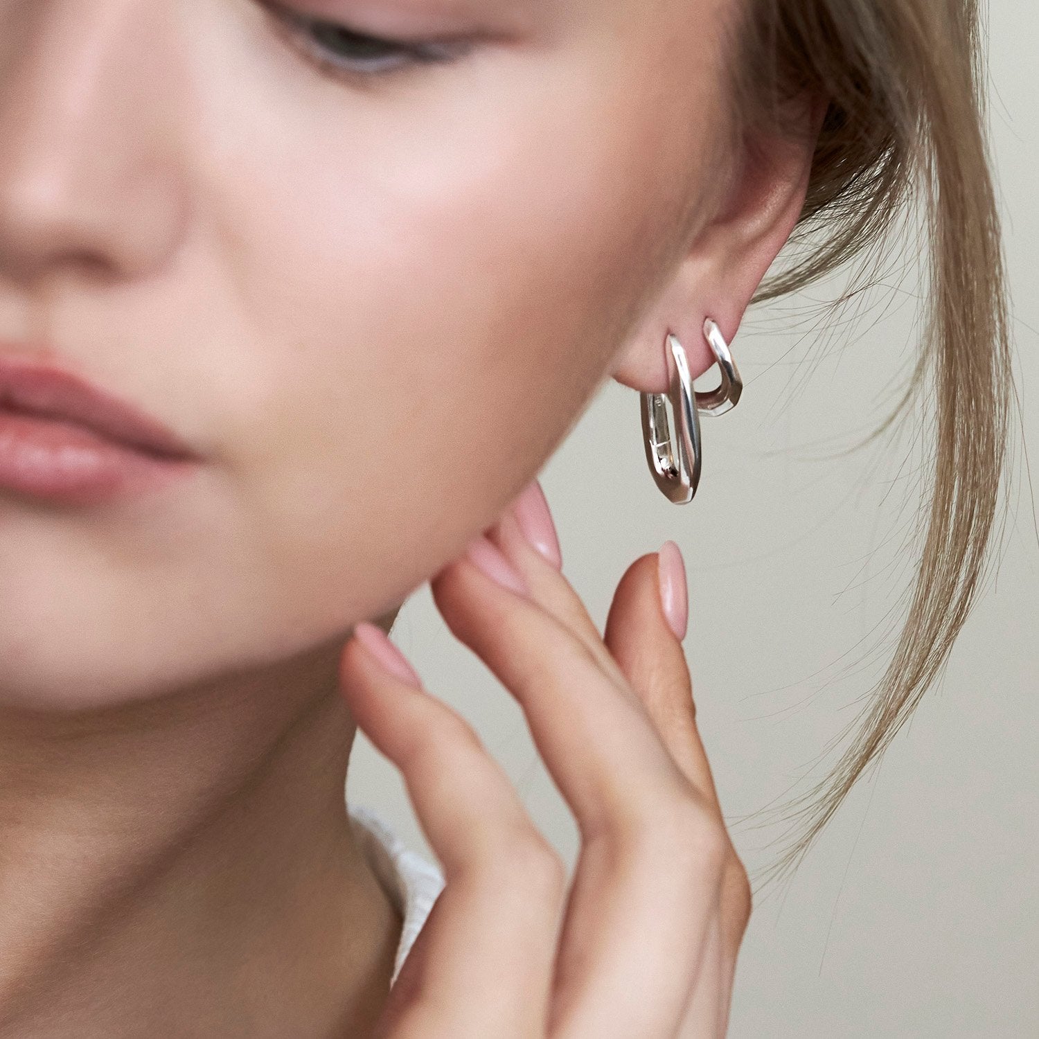 These hoops are crafted from sterling silver and have an elongated oval shape with a secure click closure.