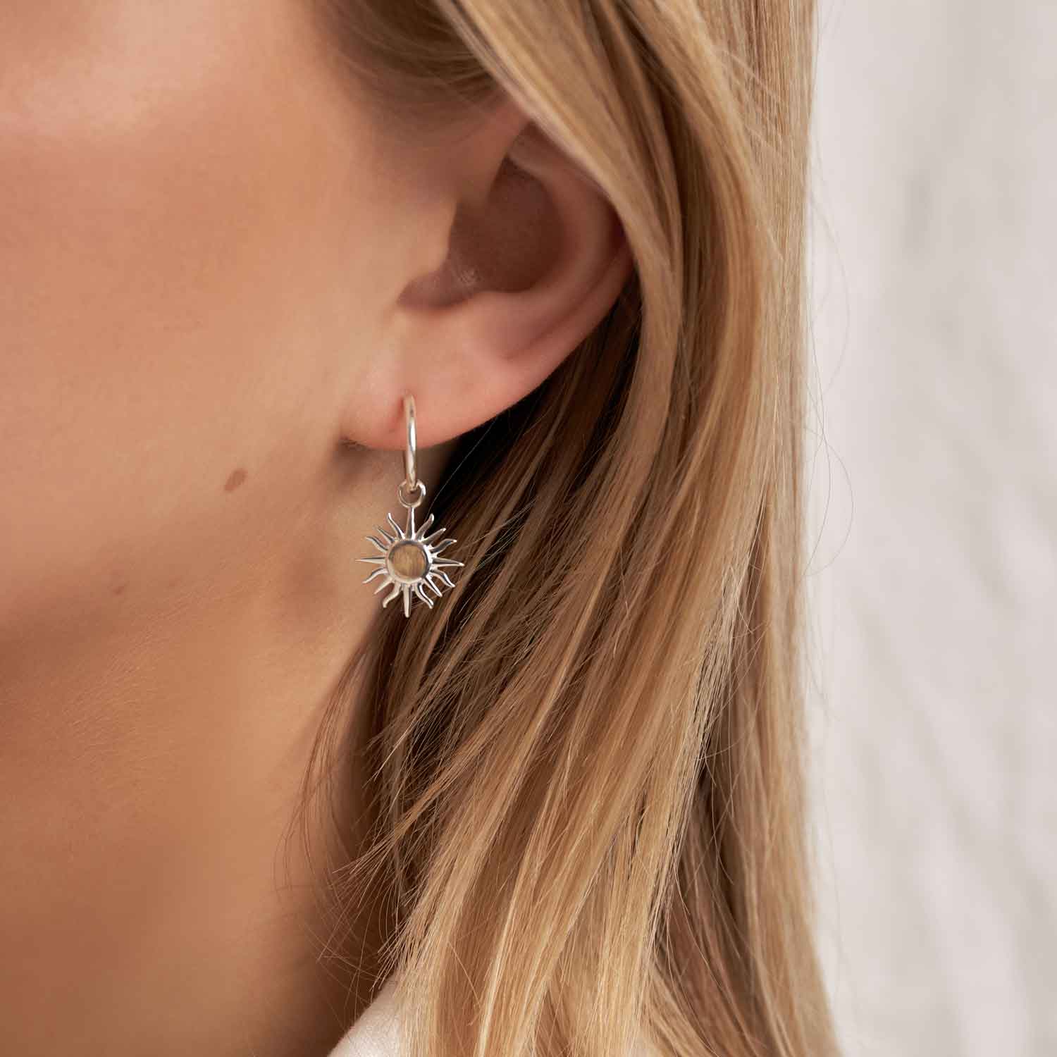 These My World Small Sun Drop Hoops by Dinny Hall are a versatile and charming accessory. The earrings feature a sun charm in recycled sterling silver with a gold-brushed center, suspended from a small click hoop. The sun charm can be removed, offering versatile styling options.