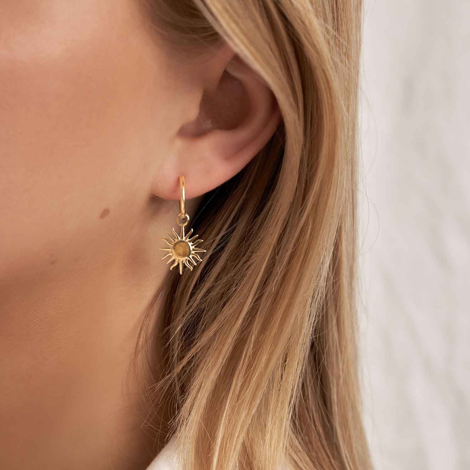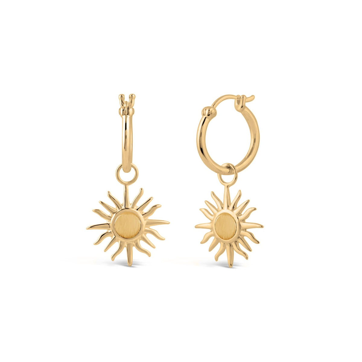 These small hoop earrings are made of 22k yellow gold vermeil with a brushed gold center. The sun charm is removable.