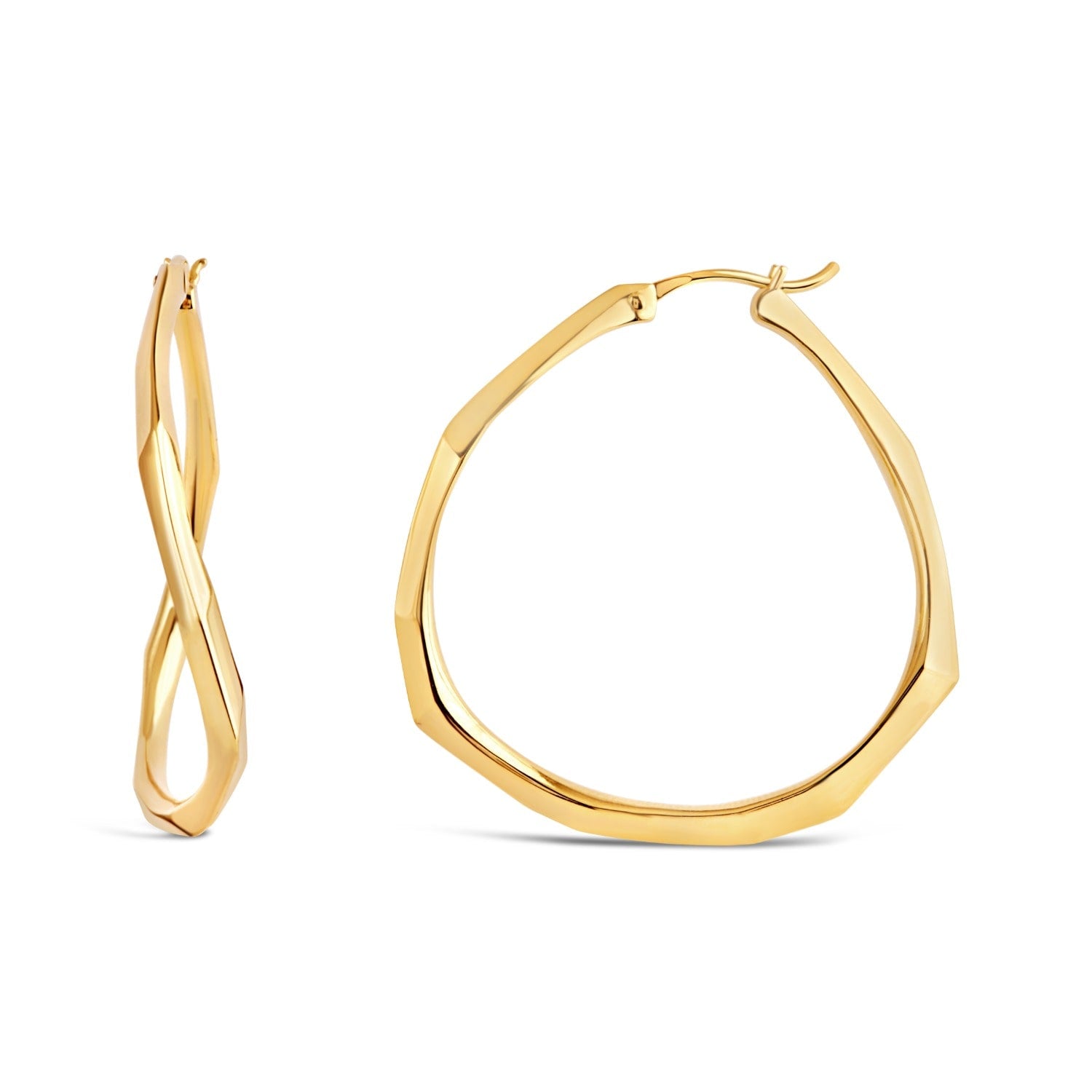 These hoop earrings are hand-carved in recycled 22k gold vermeil. They are large and have a faceted, light-refracting finish.
