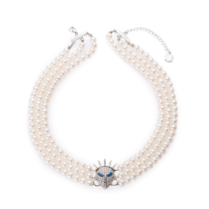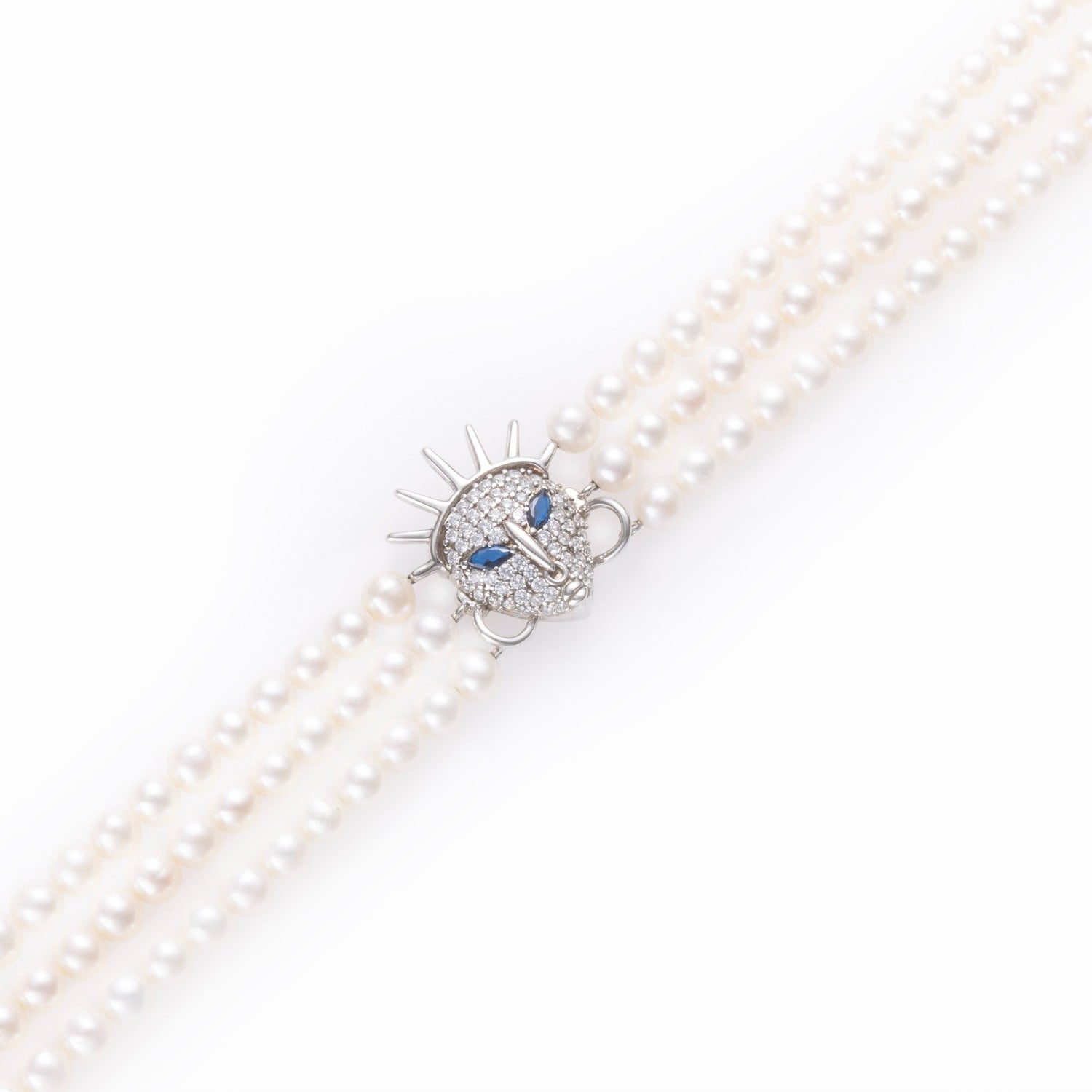 This layered necklace features hand-strung freshwater pearls, gold vermeil mask charms, and gemstone detailing with either blue sapphire or emerald accents and white topaz.