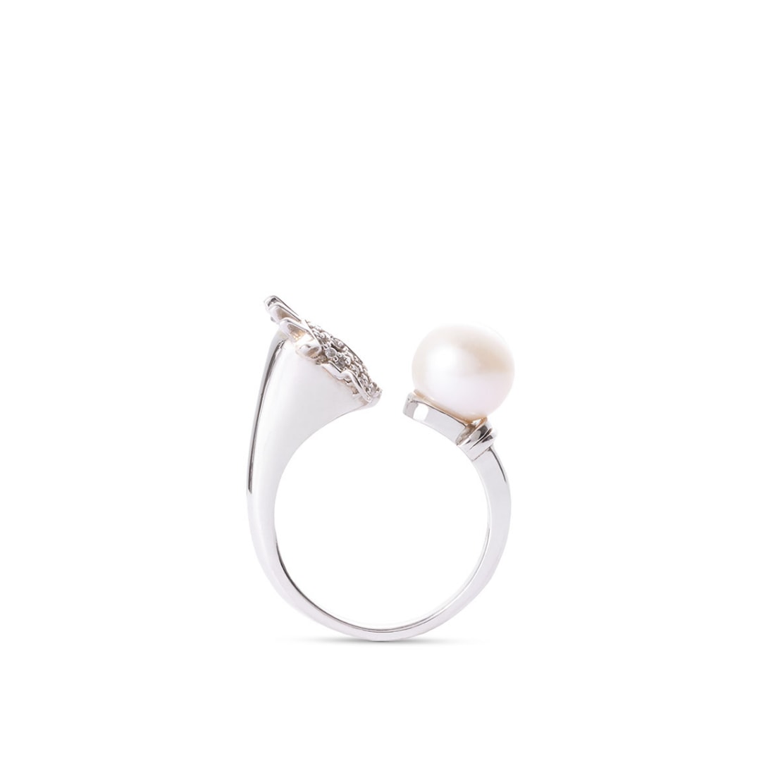 This pearl ring is made of platinum-plated silver. It features the DOLA mask design and has sapphire eyes. The material of the pearl is not explicitly stated.