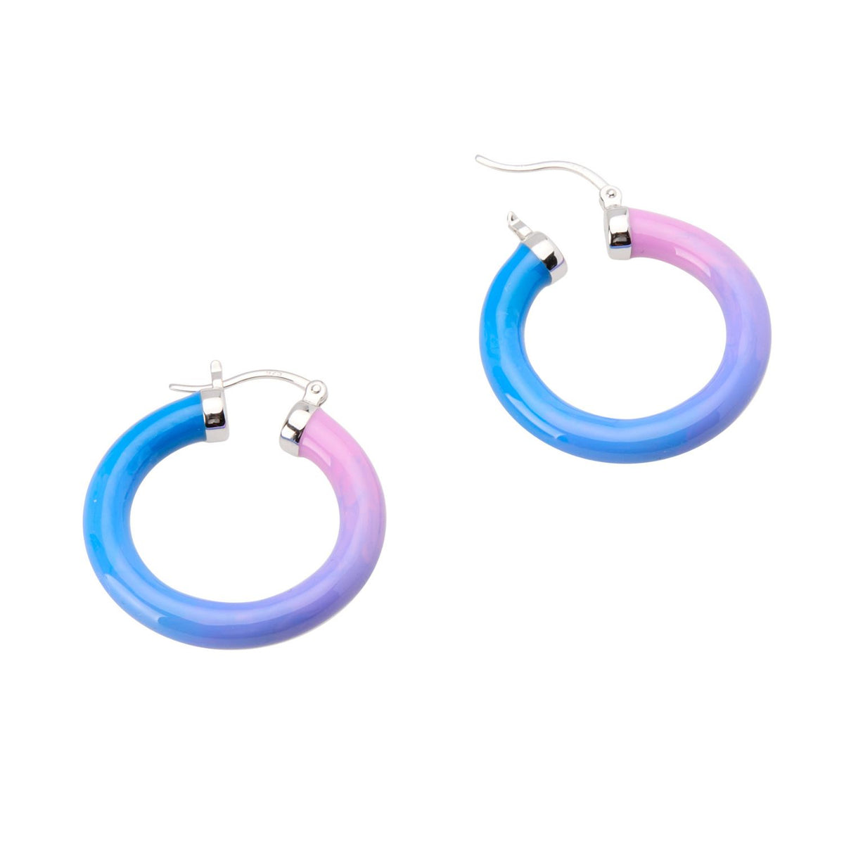 These Tropicale Dawn Hoop - Silver by Dolcetto Designs are an enchanting piece that teleports you to a tropical island. The hand-painted enamel on each earring creates a unique fingerprint, with a beautiful graduation from pink to blue reminiscent of the early dawn light. These hoops are a fresh and unique way to bring a touch of tropical sunshine to your look.