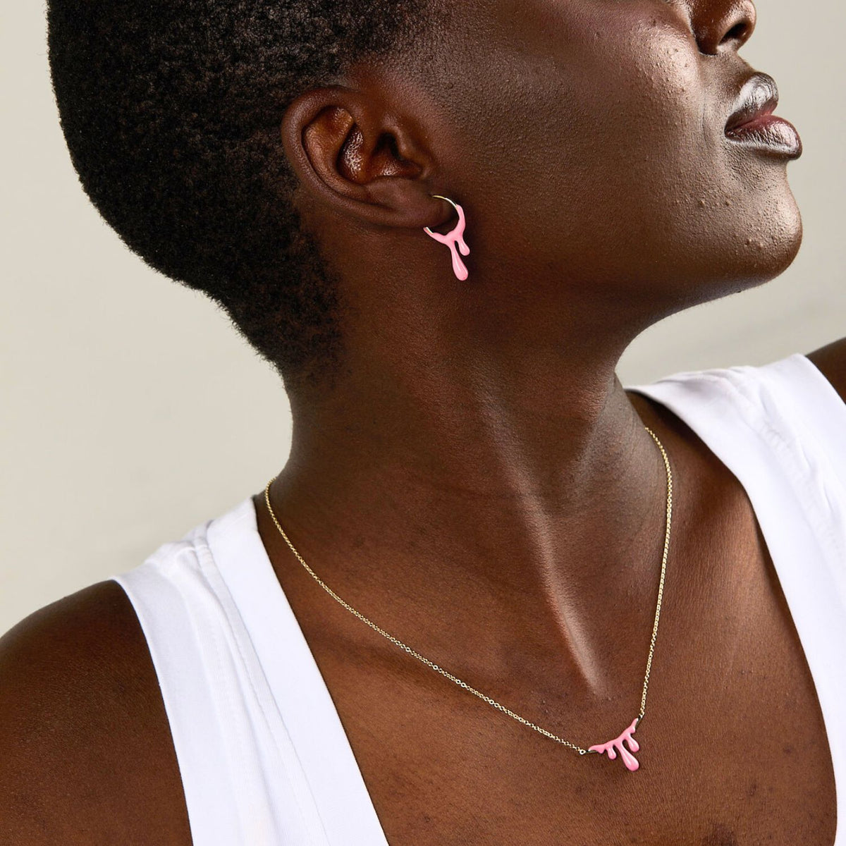 This Gelato Raspberry Hoop - Gold by Dolcetto Designs is a juicy and eye-catching hoop that brings some color into your jewelry wardrobe. It is reminiscent of a tasty summer treat and can be worn in an ear stack or on its own. Crafted from solid 9k recycled yellow gold and shiny raspberry enamel, this hoop is a fun and stylish accessory.