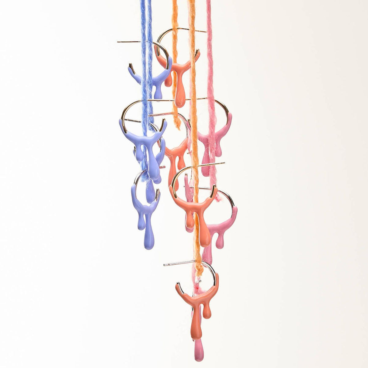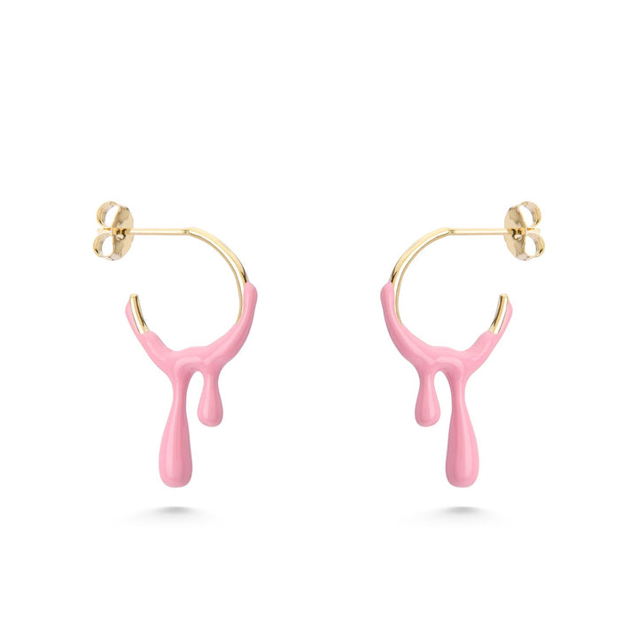 This hoop earring is made from solid 9k recycled yellow gold and features shiny raspberry enamel.
