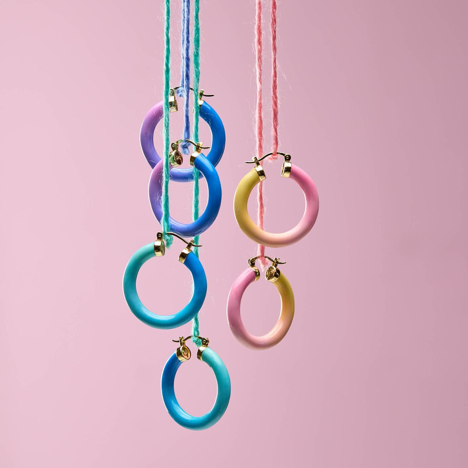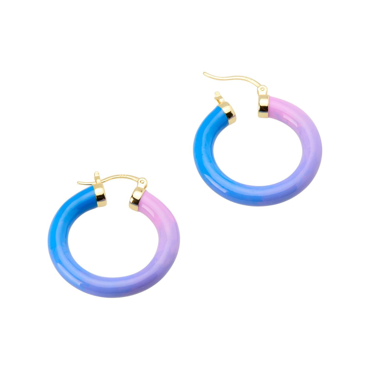 These hoop earrings are made of 18k yellow gold vermeil on solid recycled sterling silver. They feature hand-painted enamel with graduating pink-to-blue colors.
