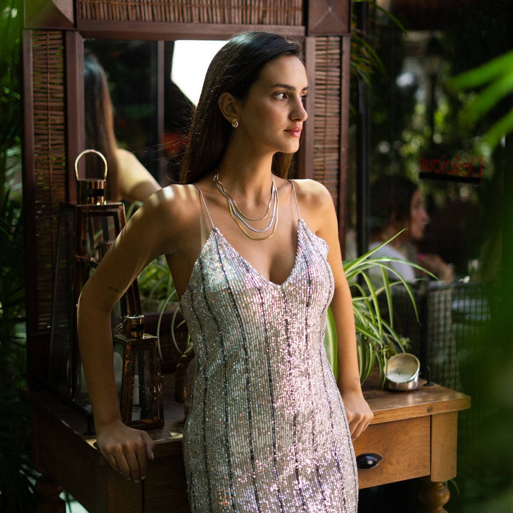 This necklace is made from water-resistant stainless steel in gold, silver, and rose tones. It features a three-layer Italian chain design with lengths of 14", 16", and 18", and a 2" extender.