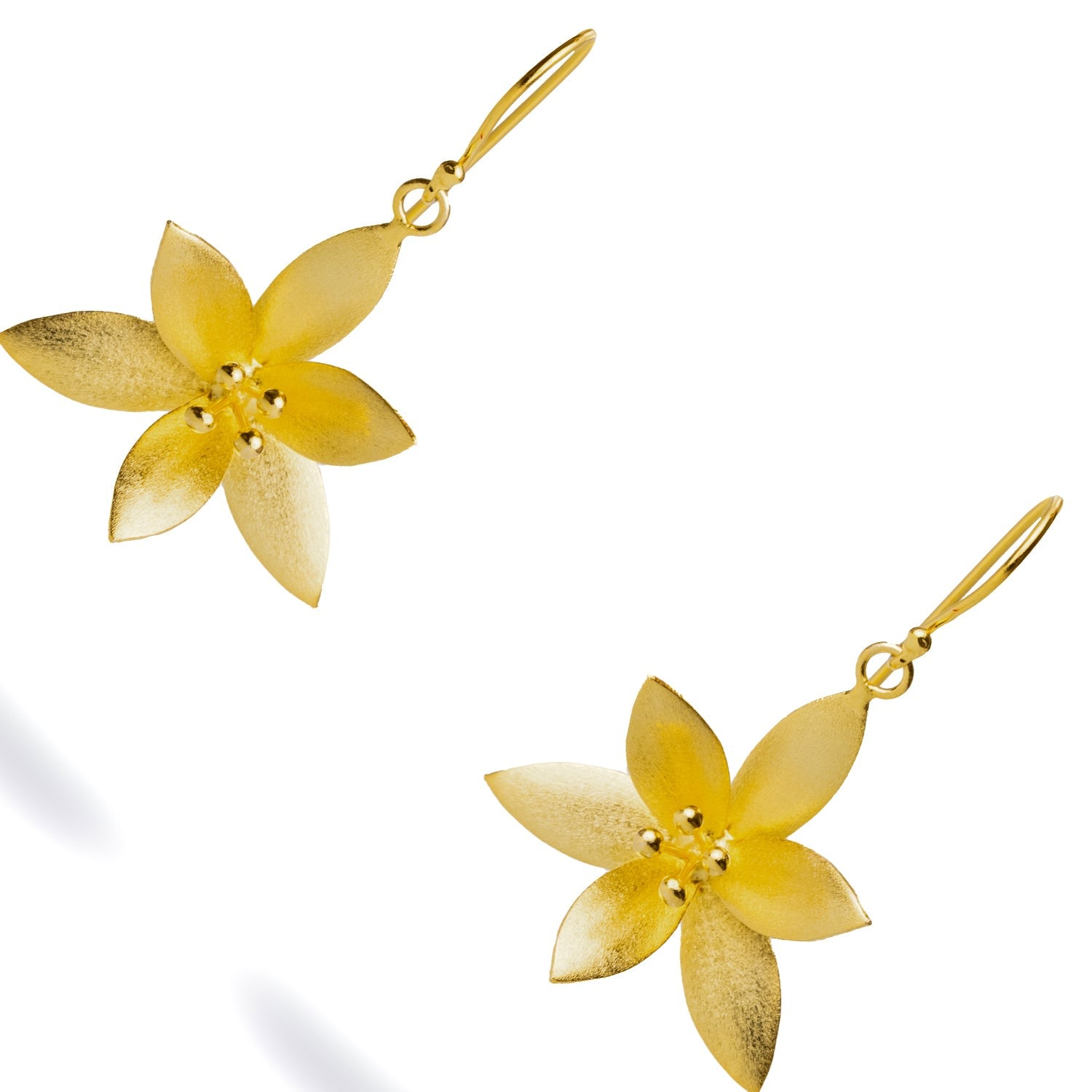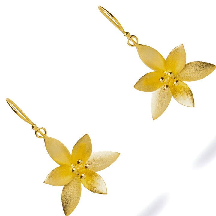 These dangle earrings are made of 18K gold plated on sterling silver. They are in the shape of a lotus blossom and have a length of 1".