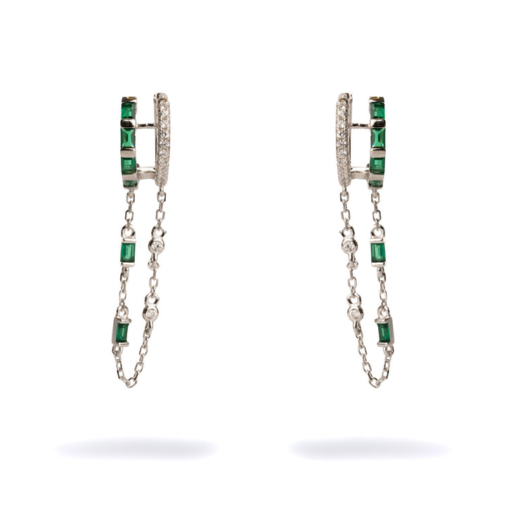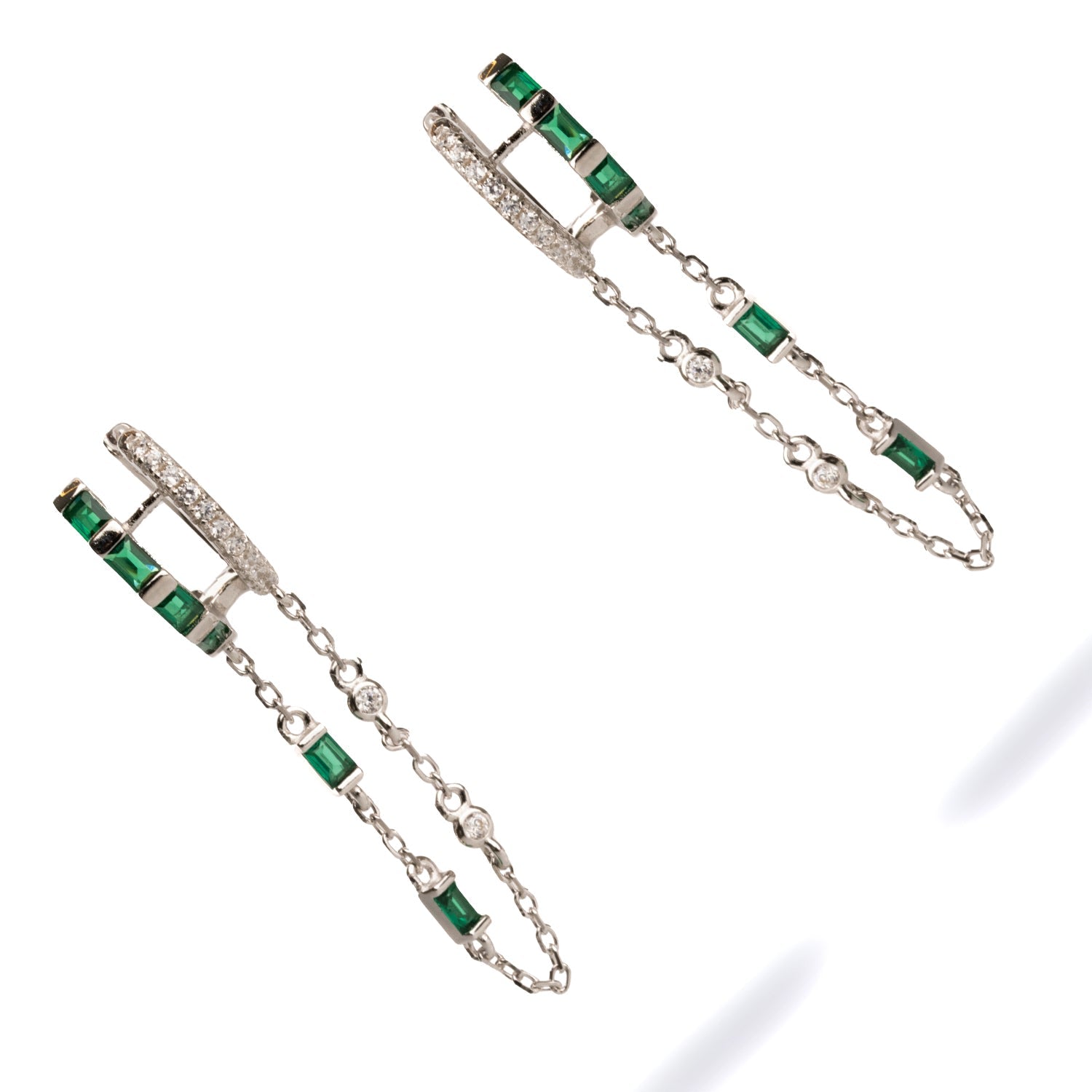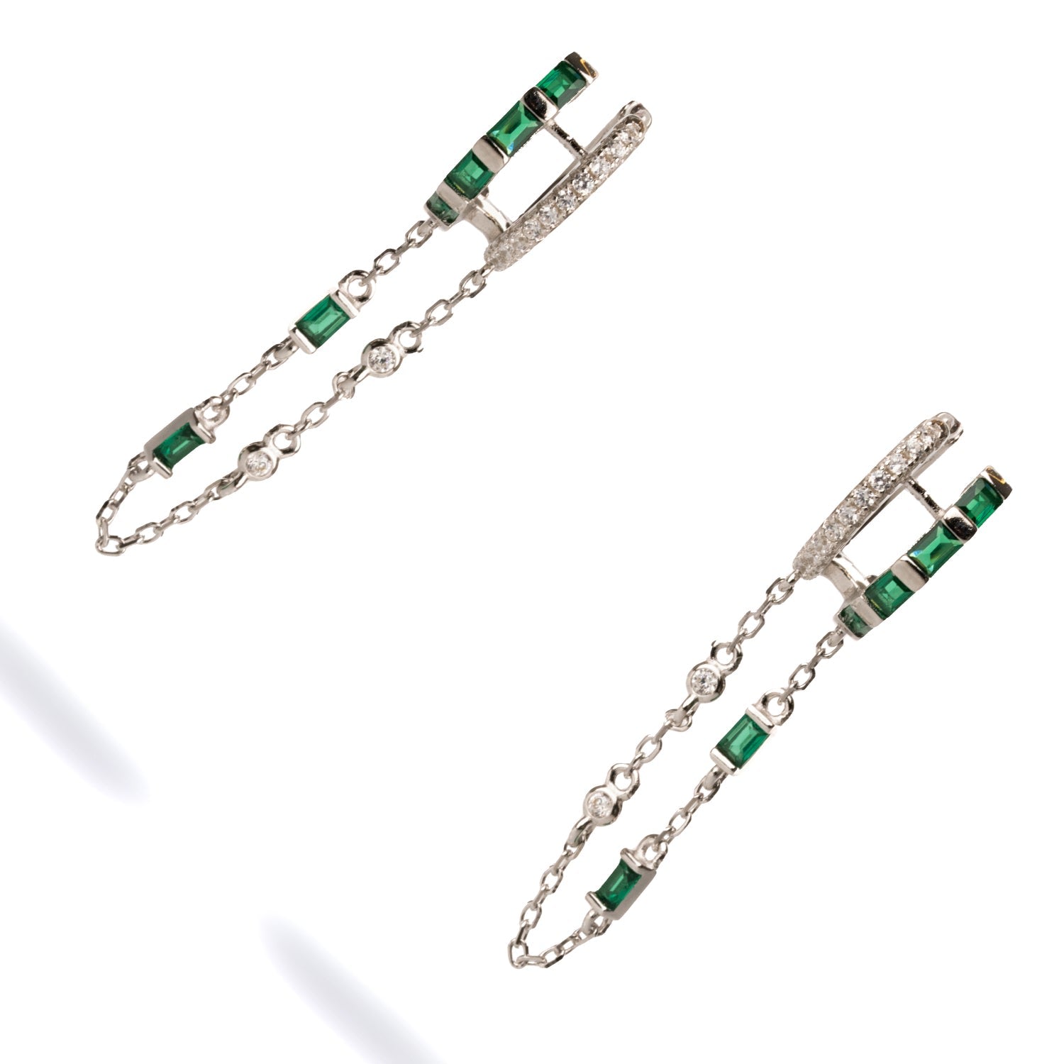 These dangle earrings are made of 925 sterling silver. They feature emerald and cubic zirconia diamonds.
