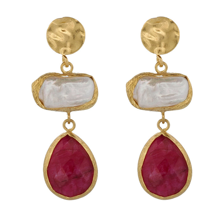 These pearl earrings are made of brass and are 24k gold plated. They feature a pearl and a ruby stone. They have a length of 2 inches.