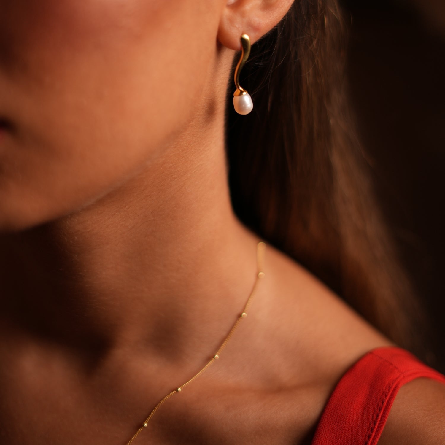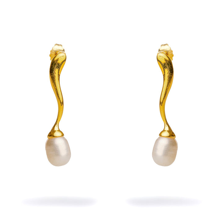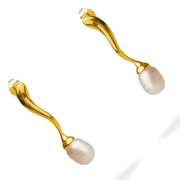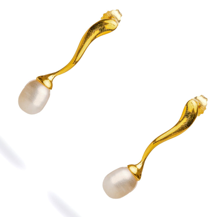 These pearl earrings are 18k gold plated on Sterling silver and feature a drop pearl. The specific type of pearl is not explicitly stated.