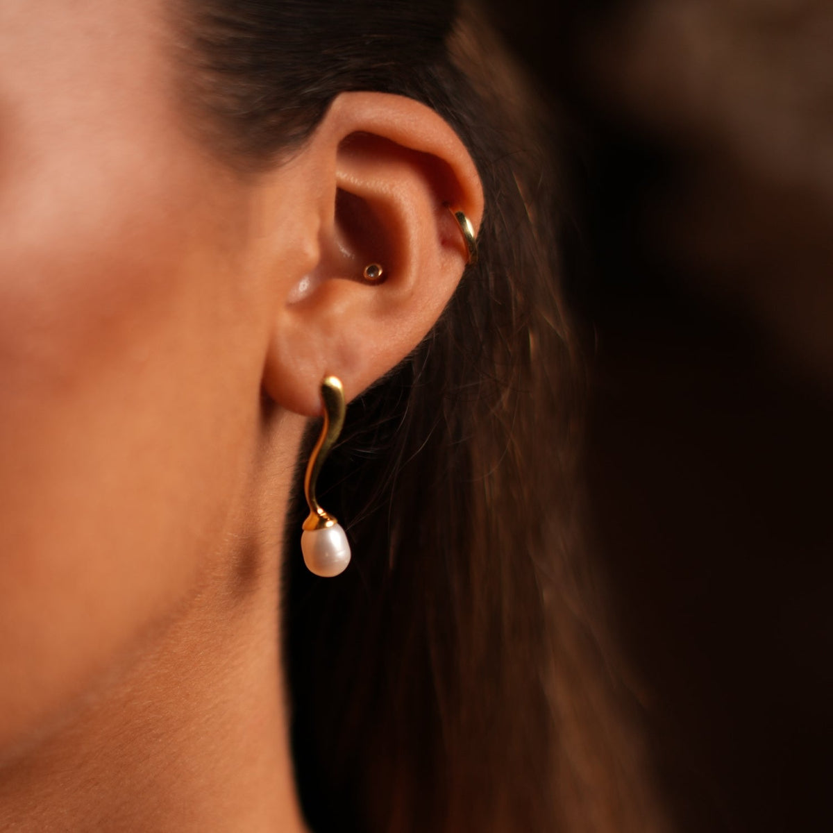 The Wave Gold Vermeil Pearl Drop Statement Earrings - Gold by Ebru Jewelry are elegant and sophisticated. These pearl earrings feature a wave-shaped gold vermeil accent, which is 18k gold plated on sterling silver. They are adorned with a delicate drop pearl. The specific type of pearl is not explicitly stated.