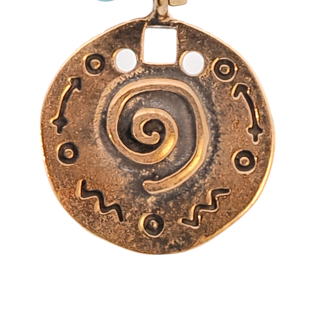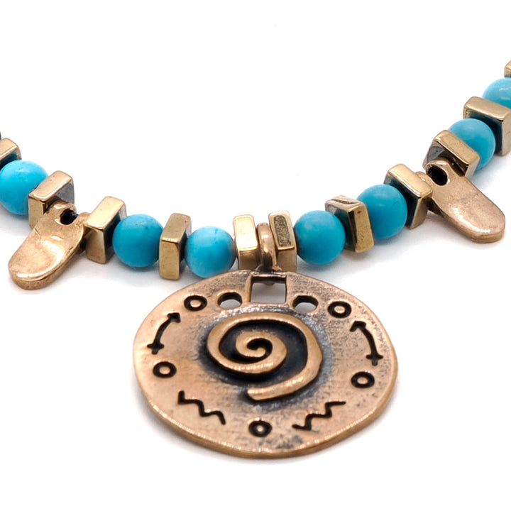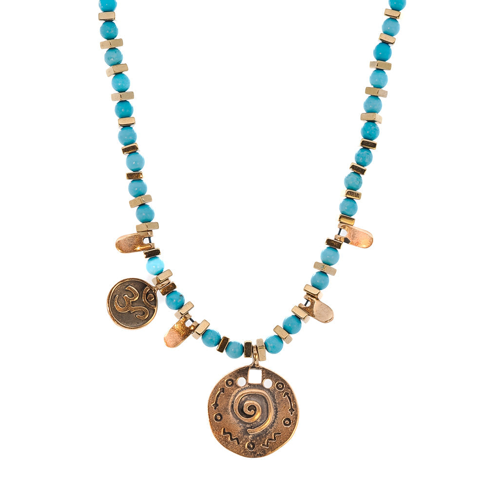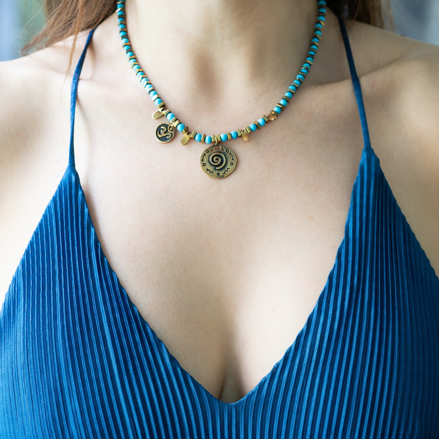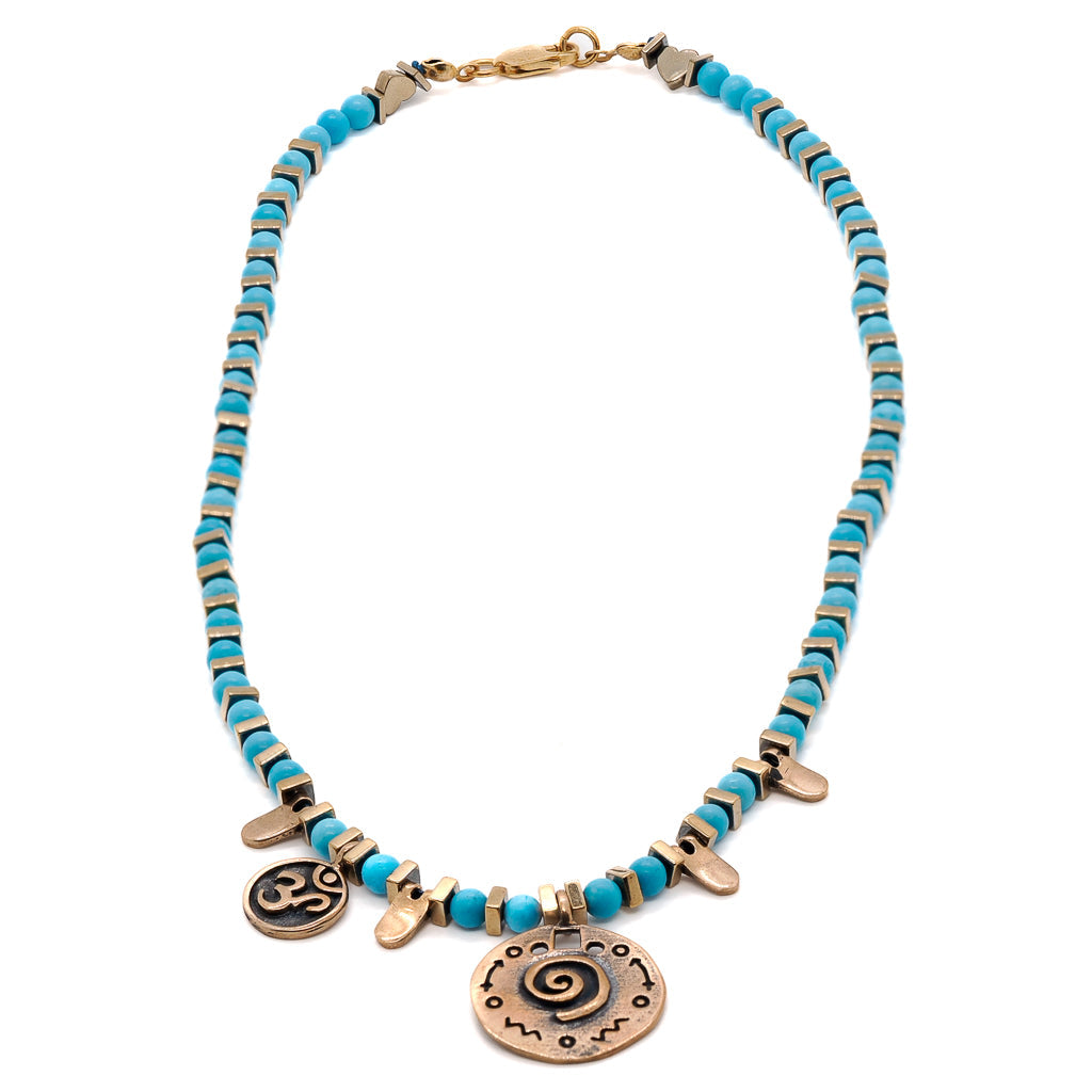 This handmade choker necklace is made from 5mm turquoise stone beads, with gold-plated bronze Om and Spiral charms. The necklace has a length of 17 inches with a 1-inch pendant.