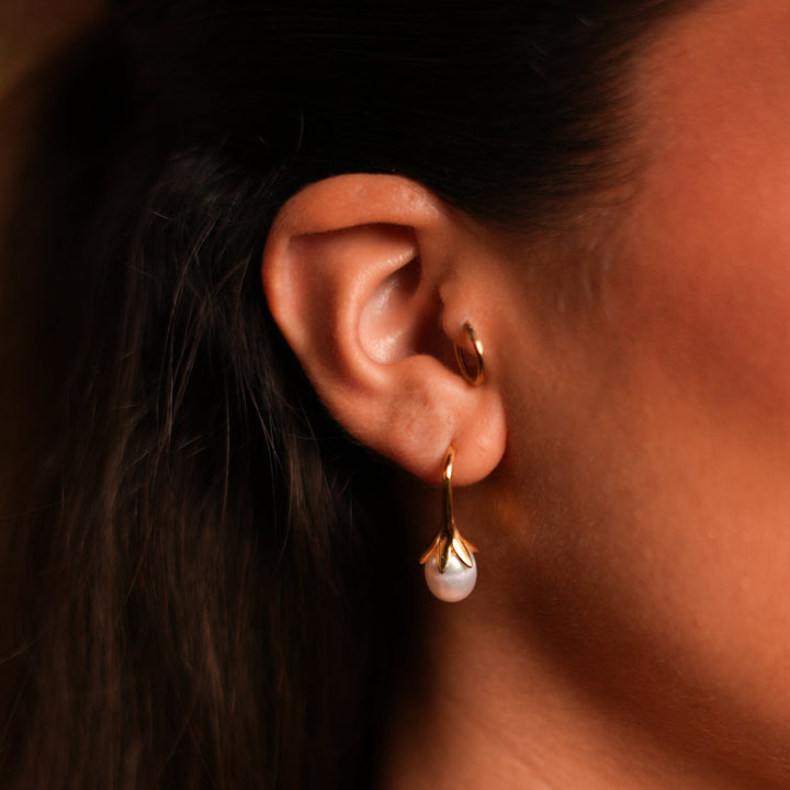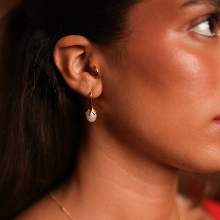 These statement pearl earrings feature a minimalist design. They are made of 18k gold plated sterling silver and a pearl stone.