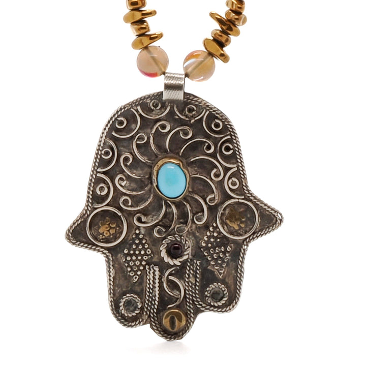 This Vintage Style Hamsa & Turtle Pendant Beaded Unique Necklace by Ebru Jewelry is a one-of-a-kind accessory that offers protection and good luck. The necklace is handmade and features a combination of various stone beads with a Tibetan bronze turtle and a silver Hamsa pendant, symbolizing long life, wisdom, and good fortune.