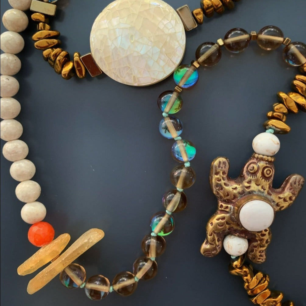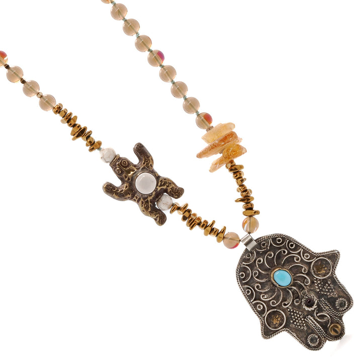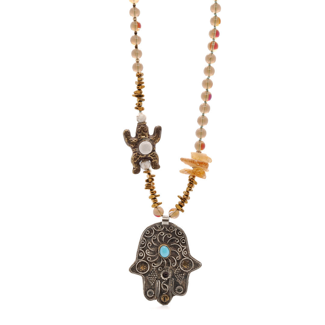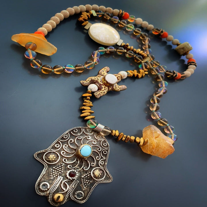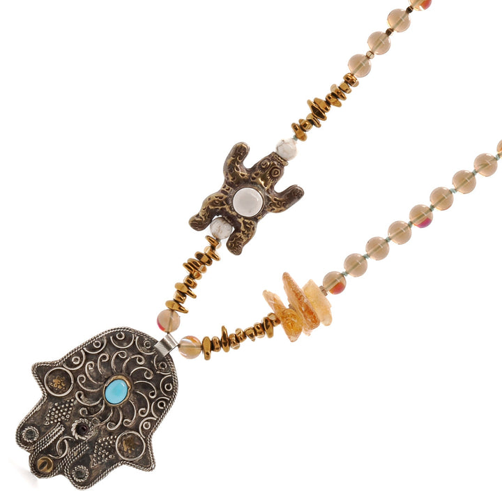 This handmade beaded necklace features white howlite, brown cat's eye, orange coral, and large amber beads, with gold hematite stone spacers. The pendants are a Tibetan bronze turtle and a silver Hamsa.