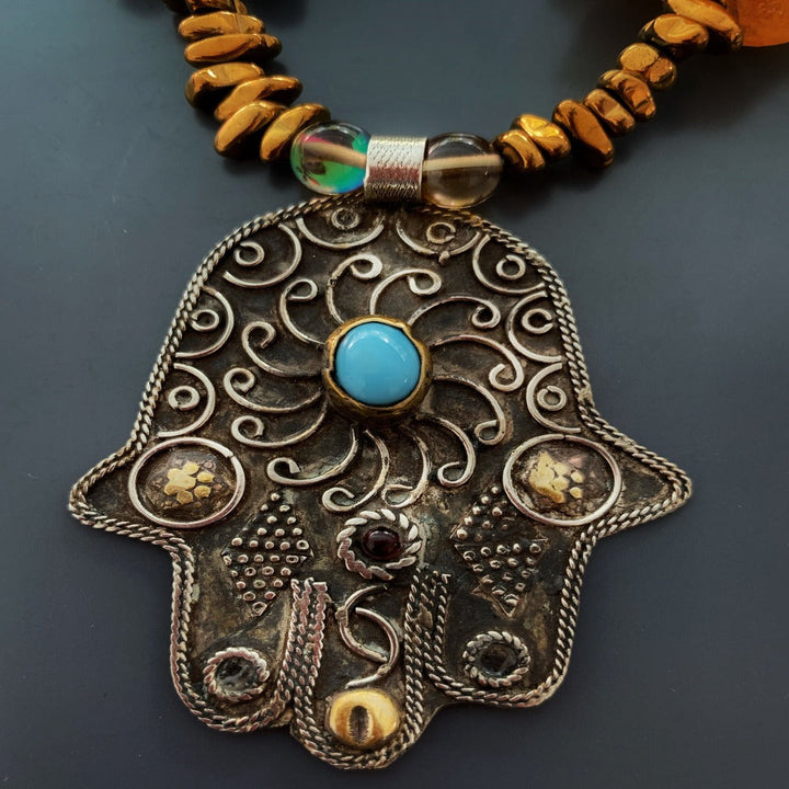 Vintage Style Hamsa & Turtle Pendant Beaded Unique Necklace - Brown