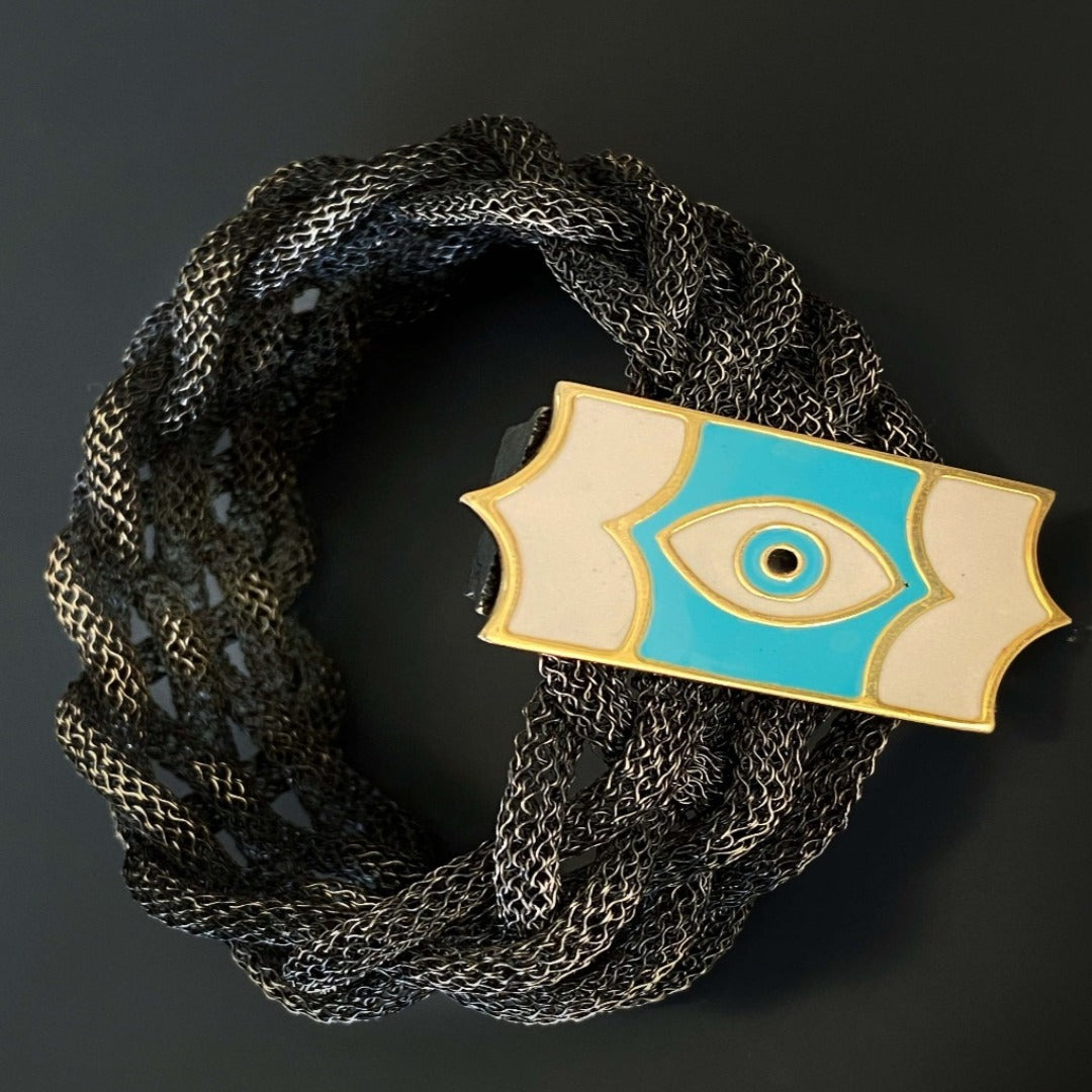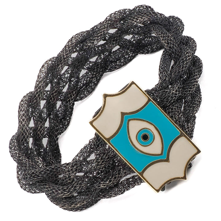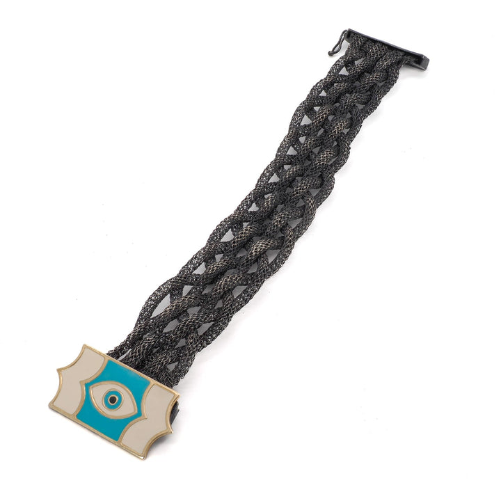 This braided bracelet is made of 925 Sterling silver. The clasp is a gold-plated evil eye with blue and white enamel. It has a size of 7 inches.