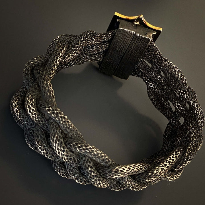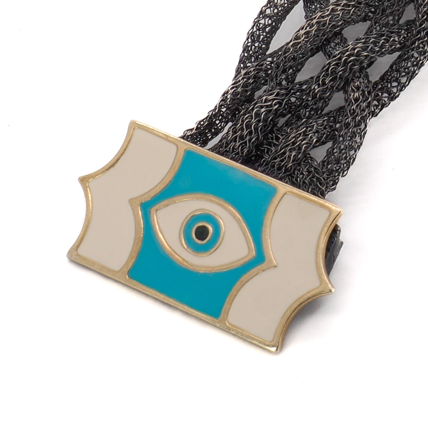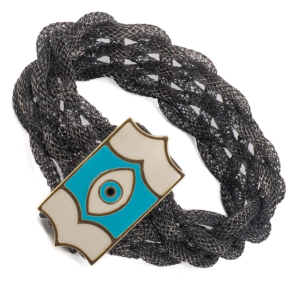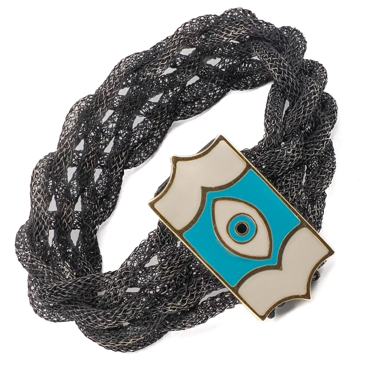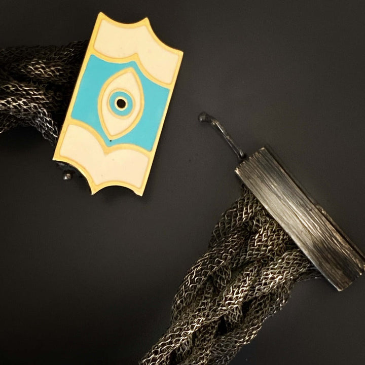 The Silver Braided Evil Eye Bracelet by Ebru Jewelry is a unique and special accessory. The bracelet features a handmade sterling silver braided band with a blue and white enamel evil eye clasp. The evil eye is a strong protection symbol, bringing good luck and happiness to the wearer.
