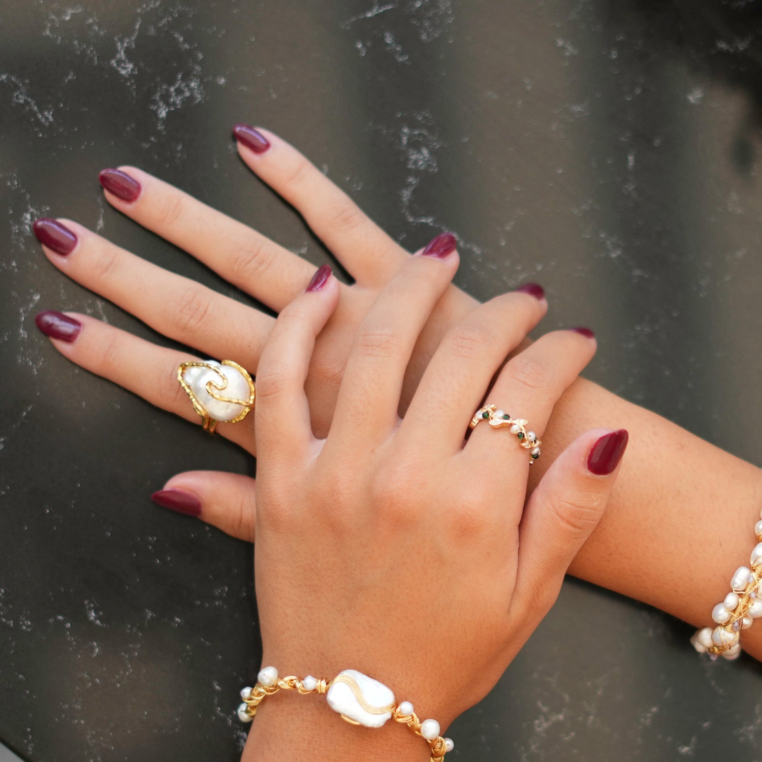 This ring is crafted from high-quality brass and plated with 24k gold. It features a pearl stone and an adjustable chunky design.
